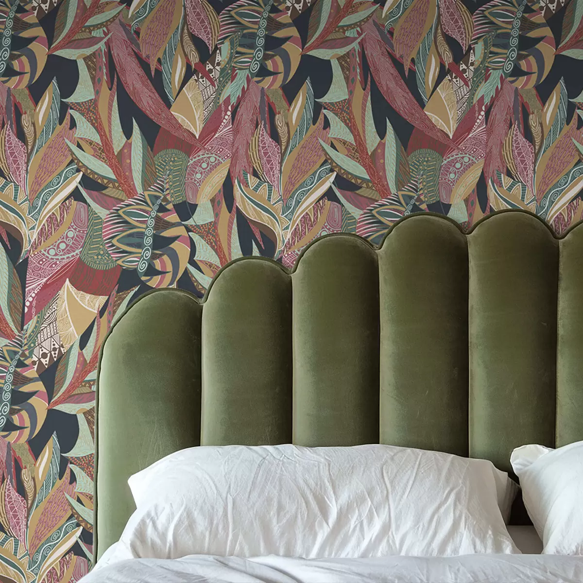 Tapete Bunte gemusterte Blätter auf dunklem Hintergrund Nr. a01120