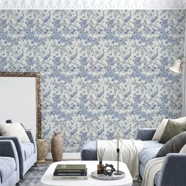 Tapete Blaues Blumenornament mit Vogel und Zweigen Nr. a01132