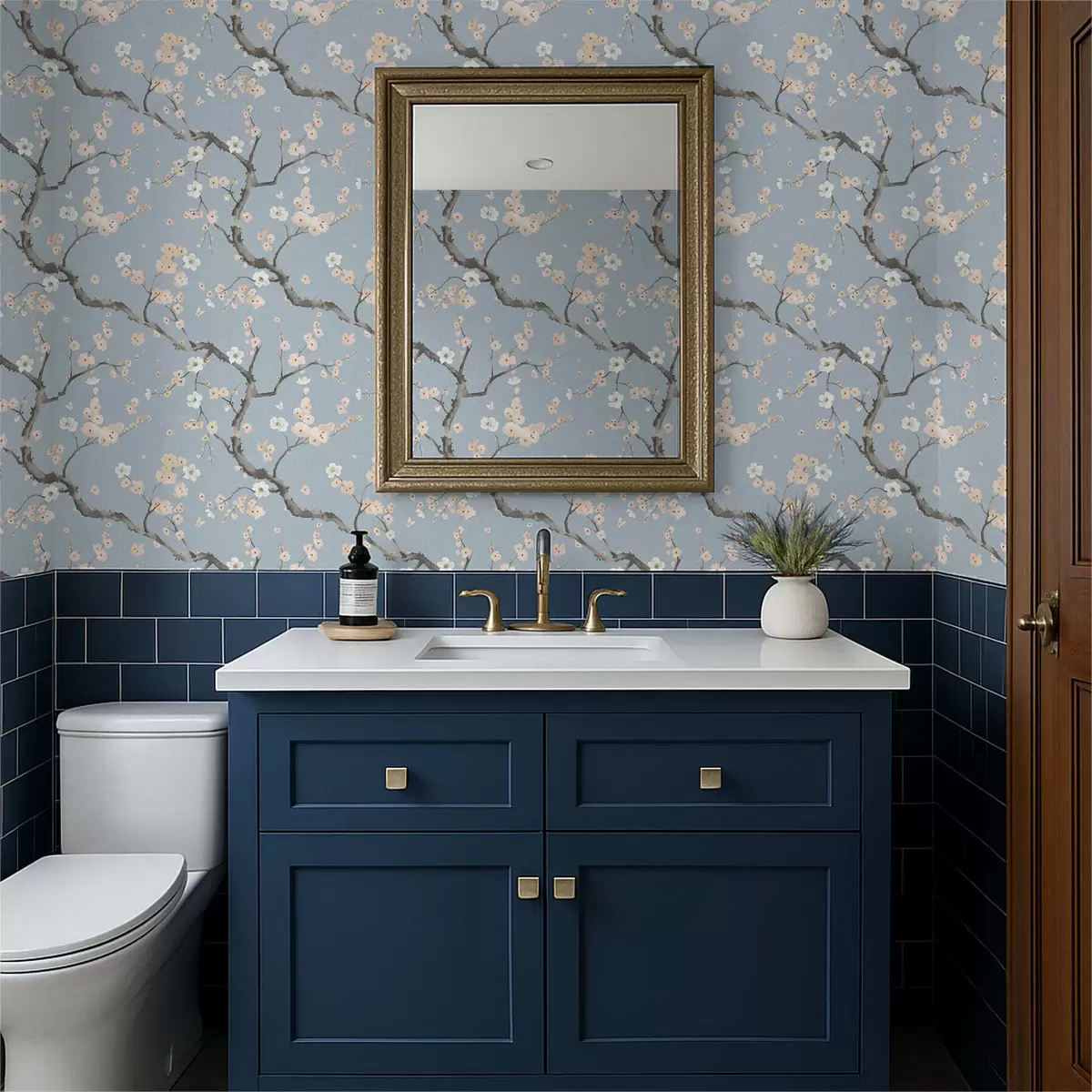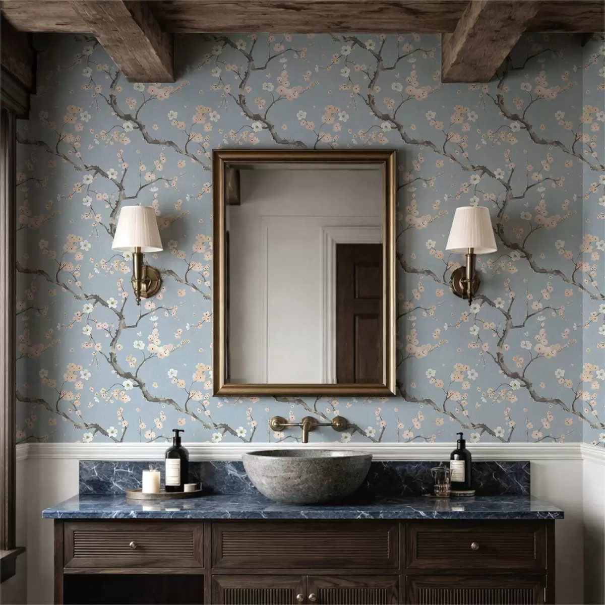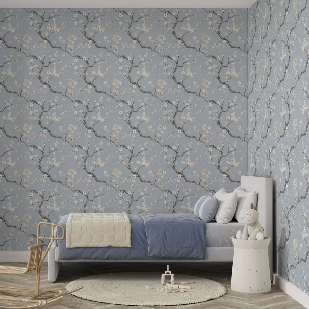Tapete Blühende Zweige vor blauem Hintergrund Nr. a01155