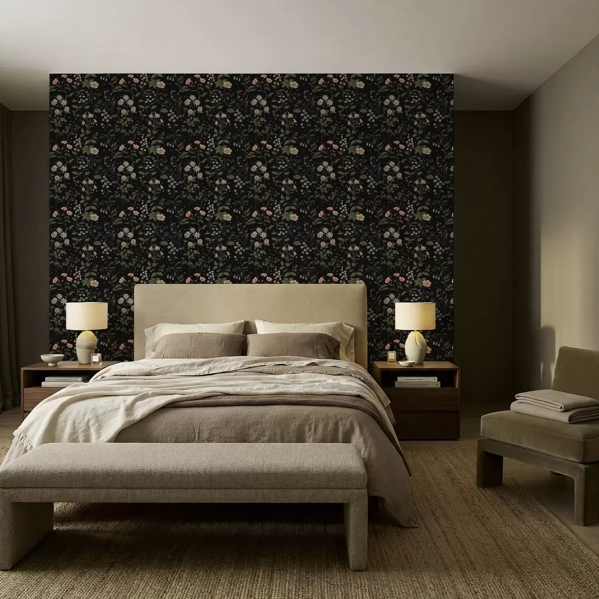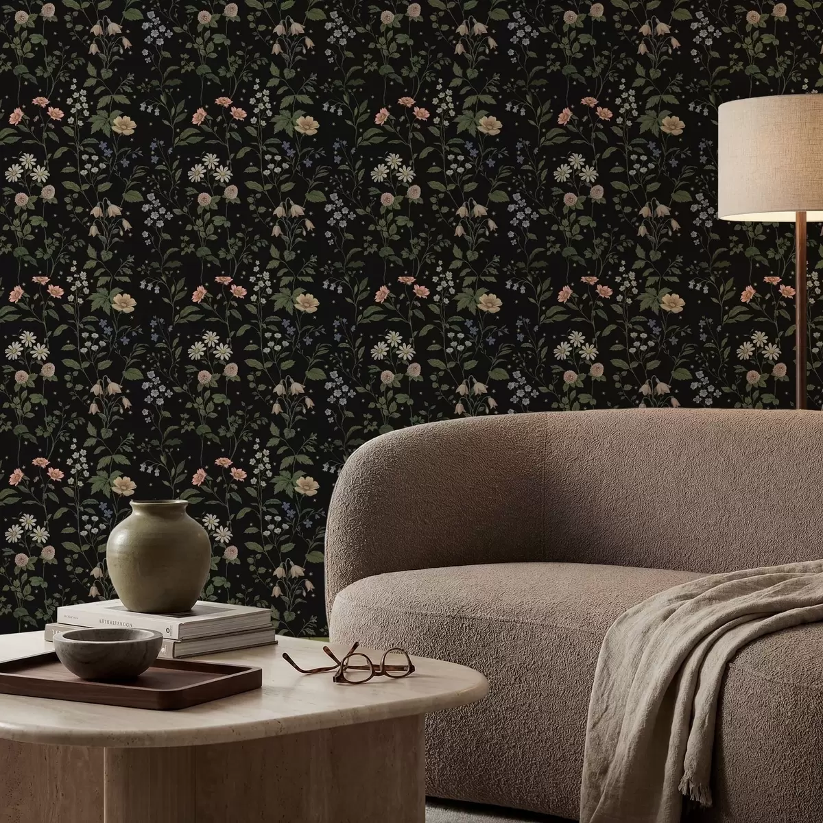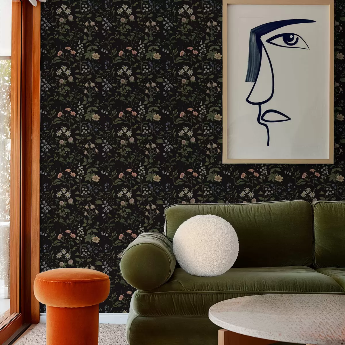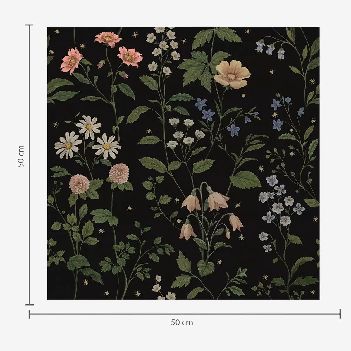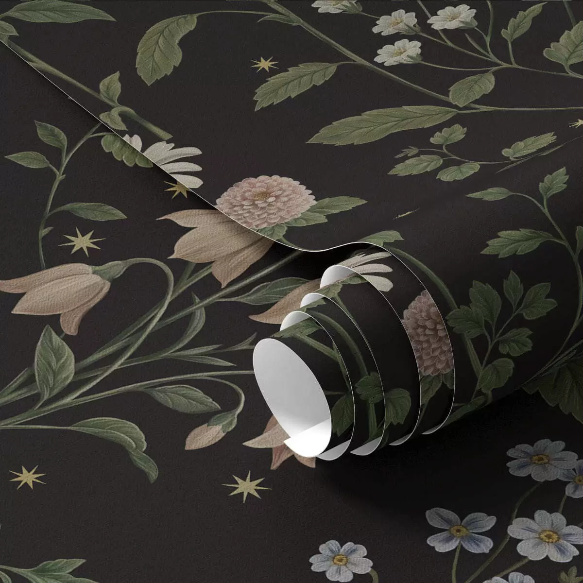 Tapete Blumenmuster auf schwarzem Hintergrund mit Sternen Nr. a01160