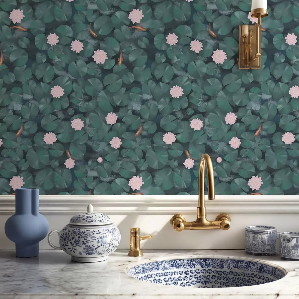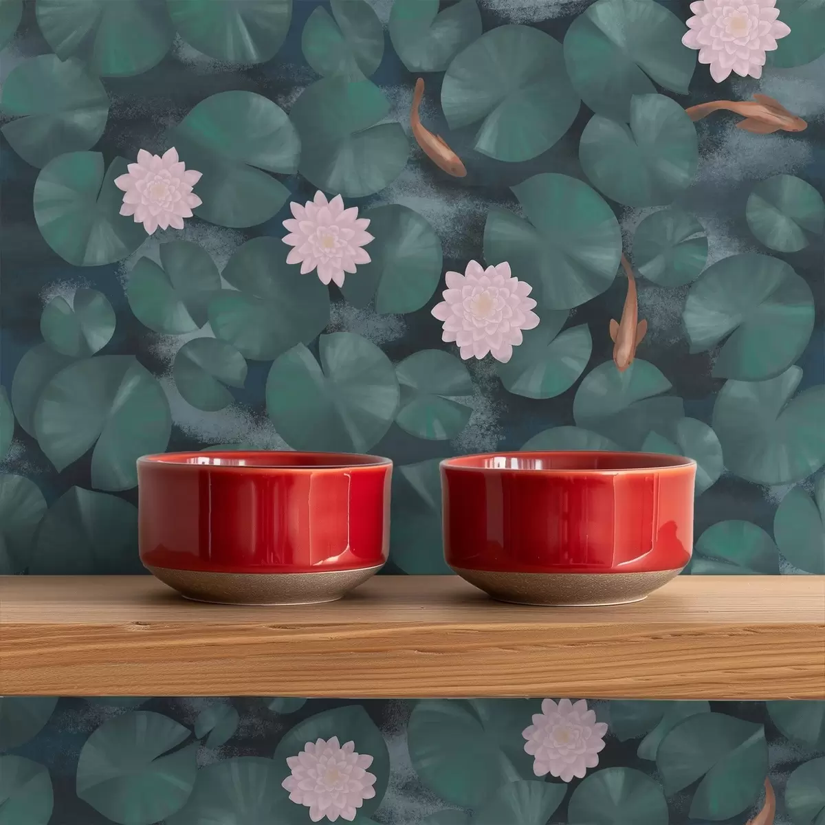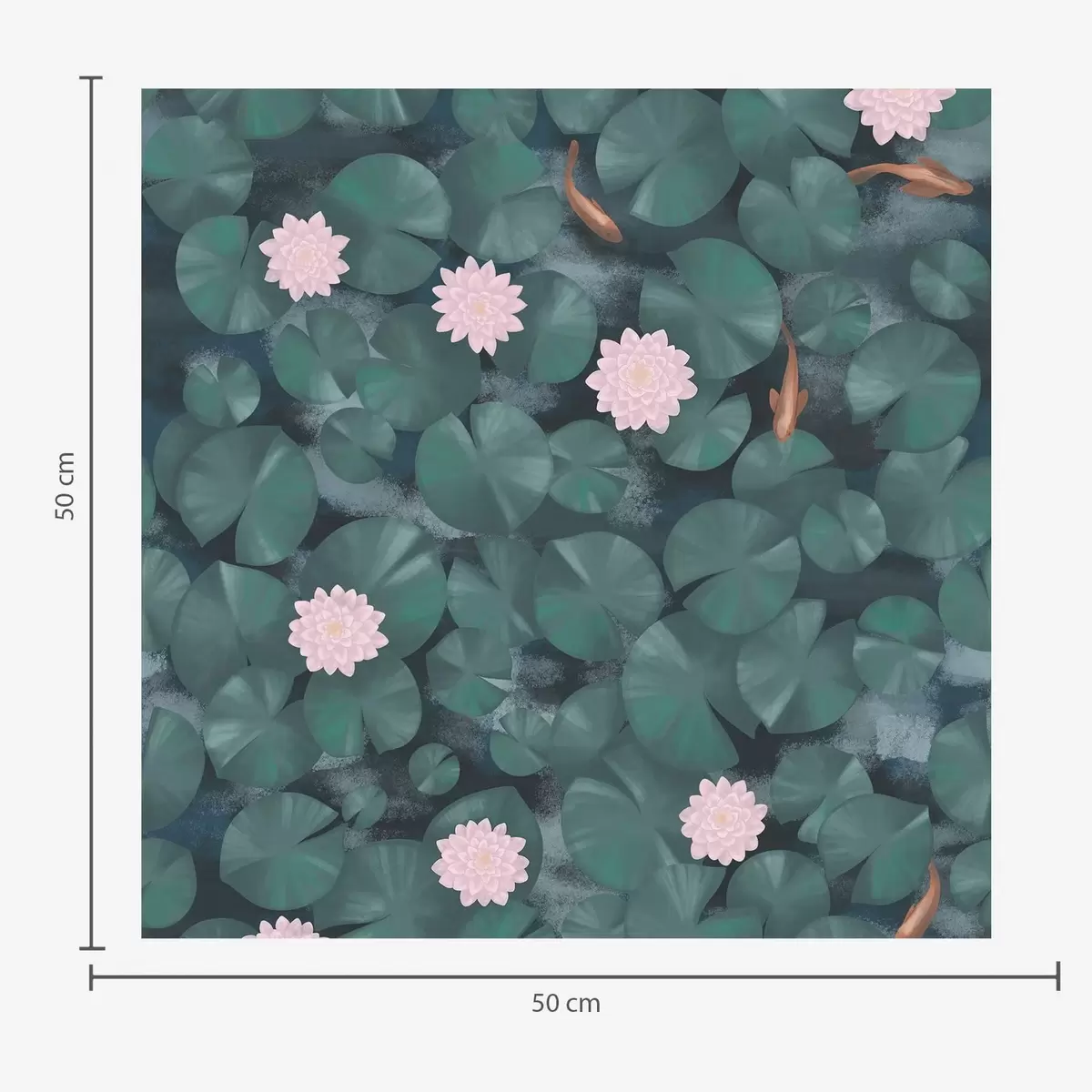 Tapete Seerosen mit Blüten und Fischen auf dunklem Hintergrund Nr. a01177