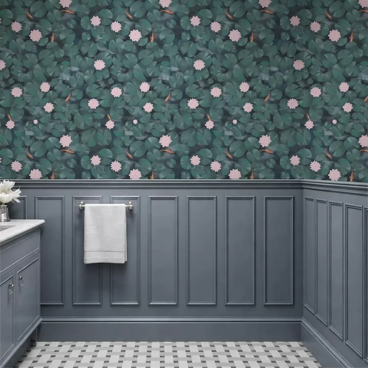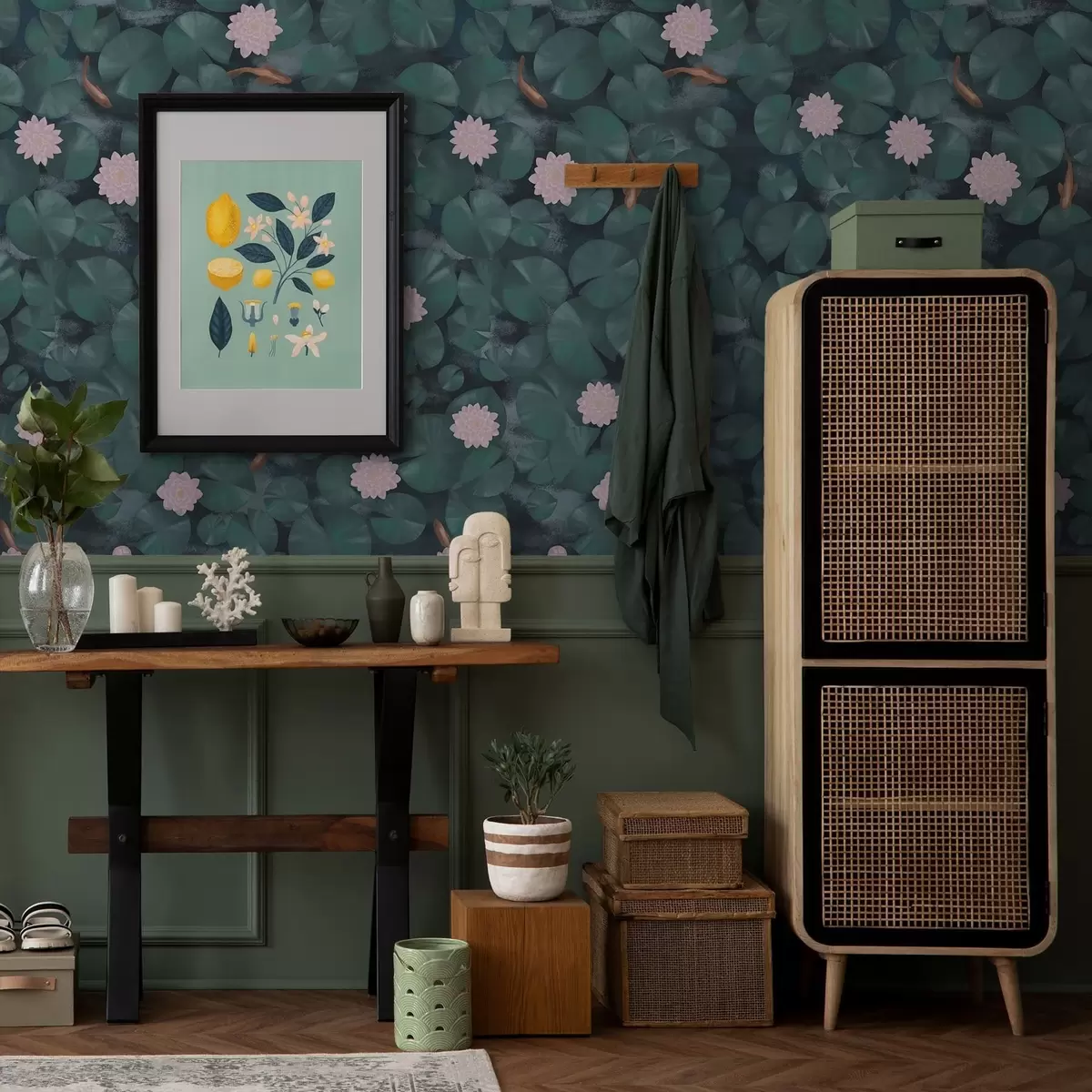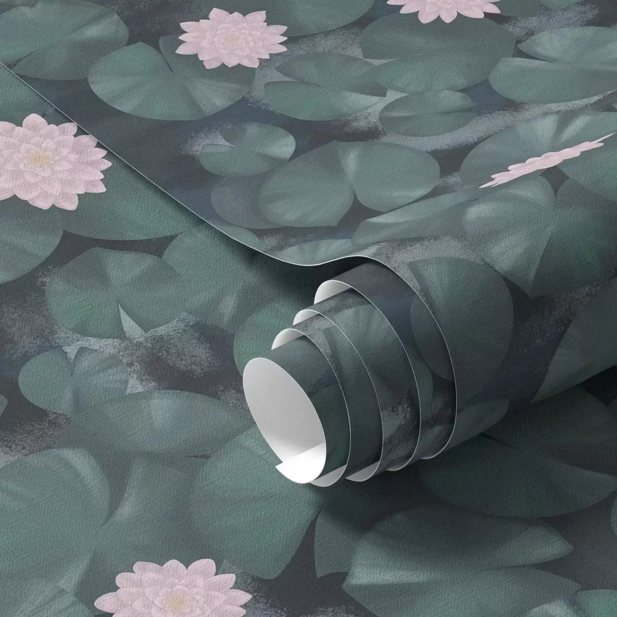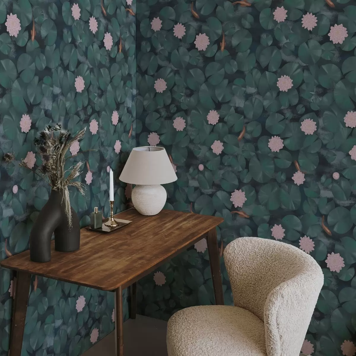 Tapete Seerosen mit Blüten und Fischen auf dunklem Hintergrund Nr. a01177