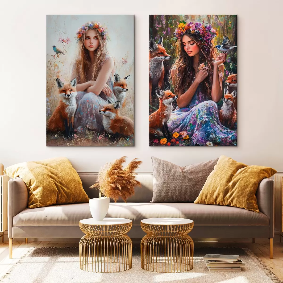 Gemälde Schöne Mädchen auf der Wiese, wilde Tiere, Füchse, Vögel, Blumenkränze Art. m00378