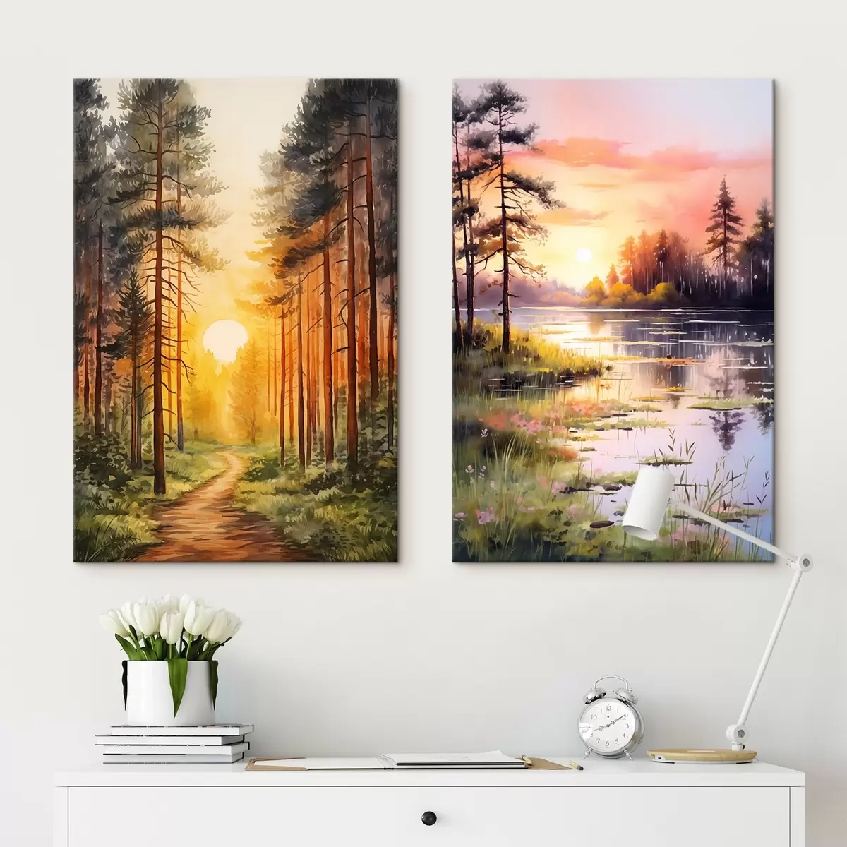 Gemälde Wald Aquarell, Nebel auf dem See, Sonnenuntergang Himmel, Bäume und Blumen Art. m00382
