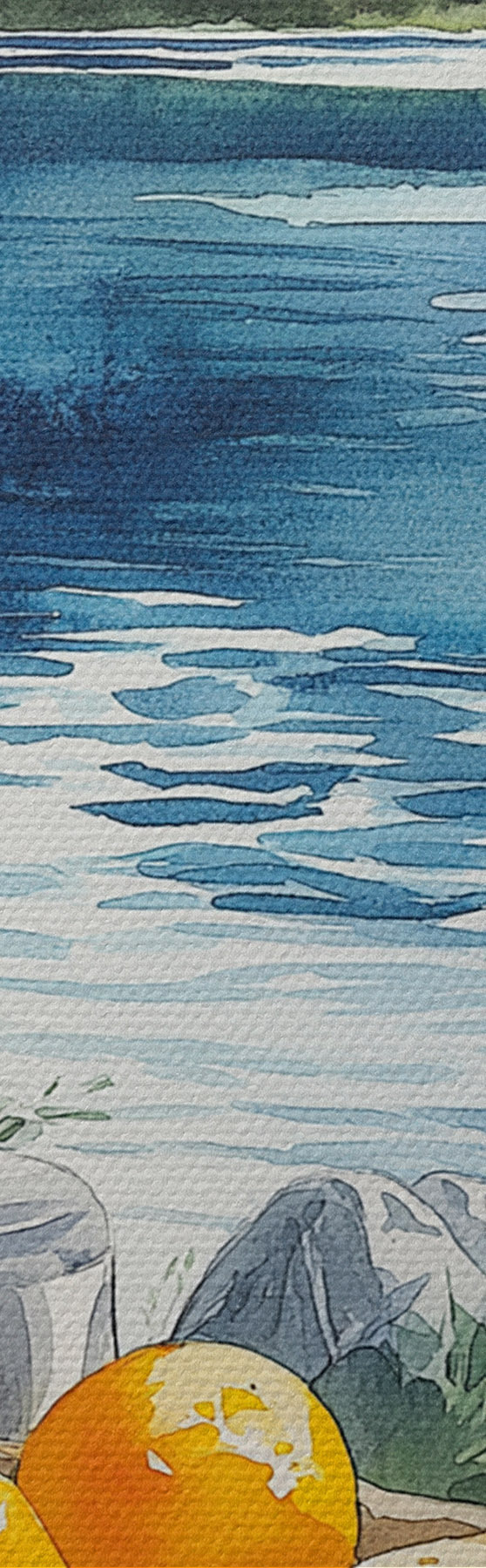 Gemälde Frühstück in der Natur, Reisen, Leben im Freien, Aquarellstil, Norwegen Art. m00404