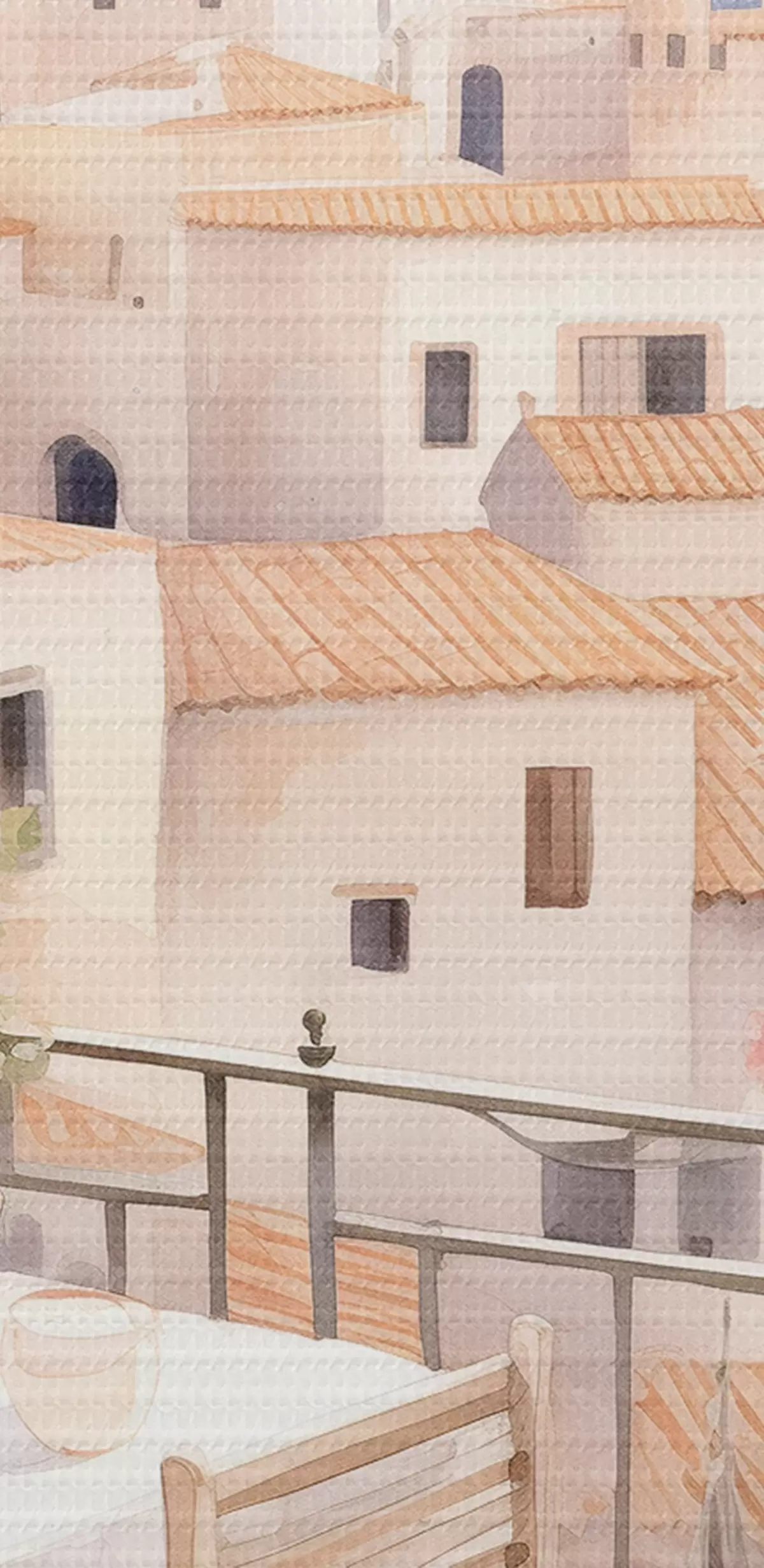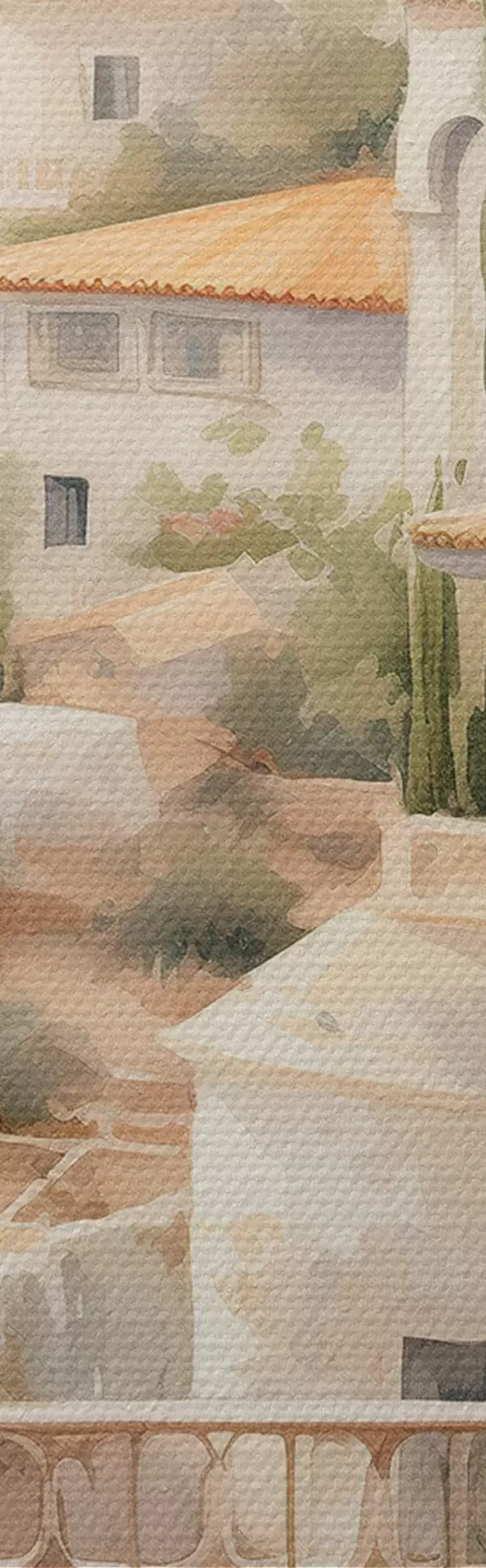 Fototapete Sonnenuntergang auf dem Balkon, Architektur, blühende Blumen, Aquarellstil, mediterran m00420