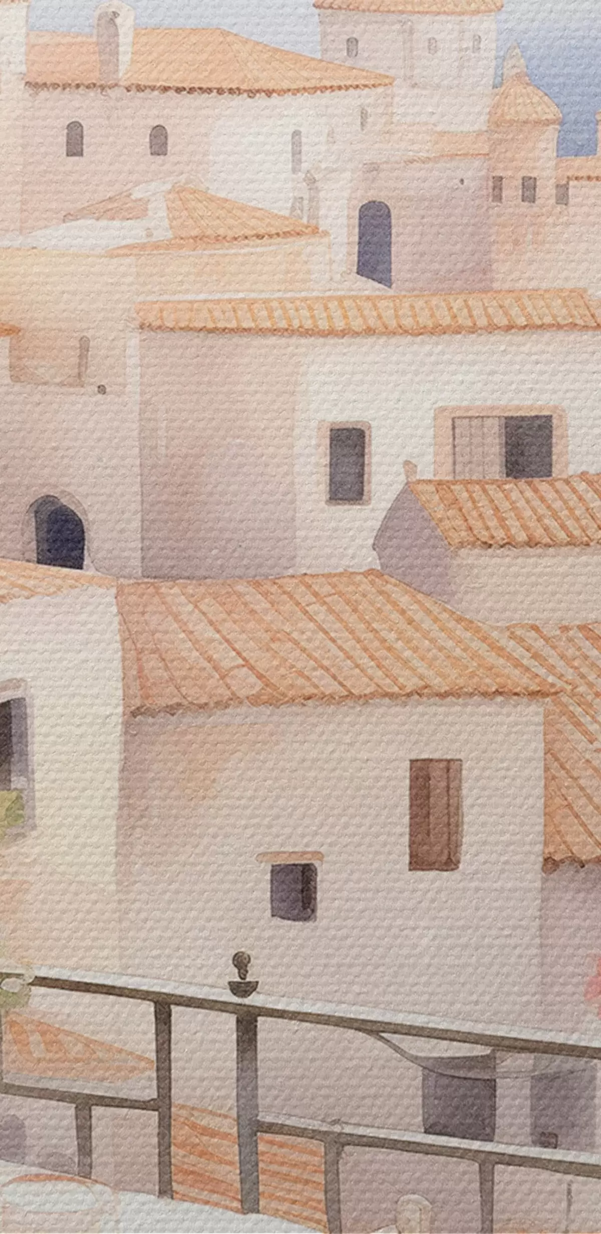 Gemälde Sonnenuntergang auf dem Balkon, Architektur, blühende Blumen, Aquarellstil, mediterran Art. m00420