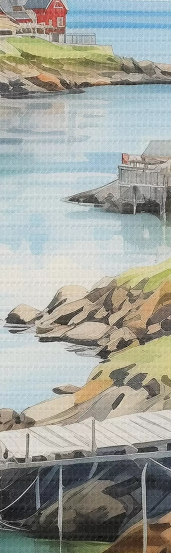 Gemälde Norwegen Natur, Lofoten Inseln, Sommerlandschaft, rote Häuser, Berge, Boote Art. m00421
