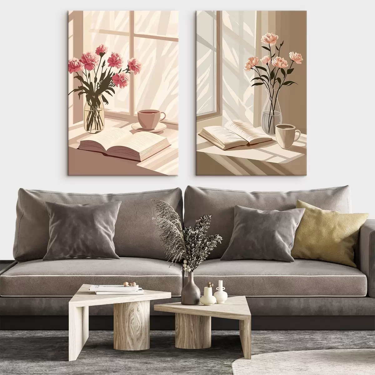 Gemälde Abstraktion, Morgenästhetik, Tasse Kaffee, Buch, Blumen Art. m00448