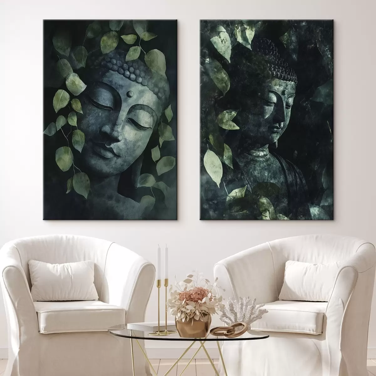 Gemälde Grüner Buddha in tropischen Blättern, Aquarellstil Art. m00451