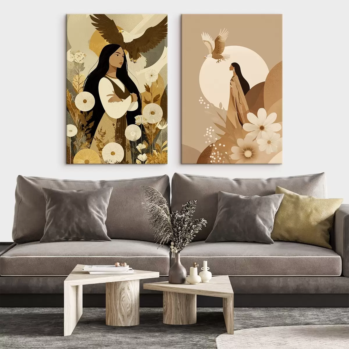 Fototapete Frauen mit fliegenden Adlern, Tribal-Stil, beige Farben m00477