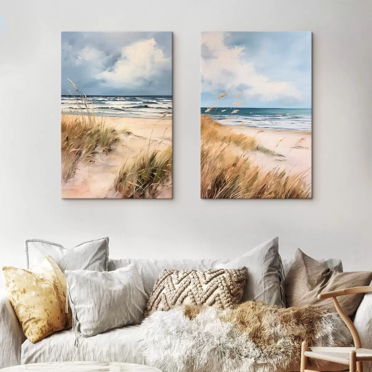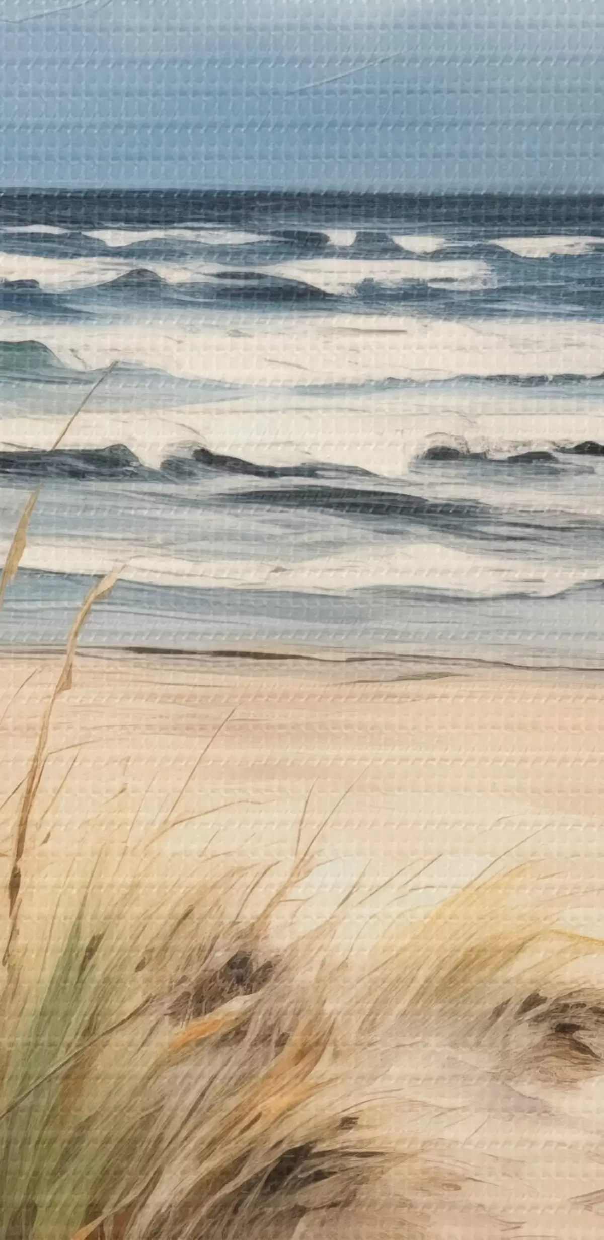Gemälde Ein Sandstrand mit hohem Gras im Vordergrund, das Meer mit Wellen und ein bewölkter Himmel im Hintergrund Art. m00521