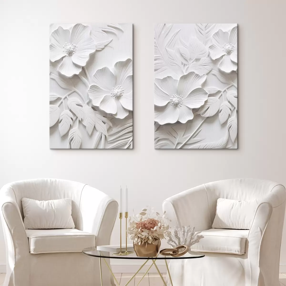 Gemälde Dekorative minimalistische weiße Blumen mit Blättern, Relief-Imitation, weißer Hintergrund Art. m00524