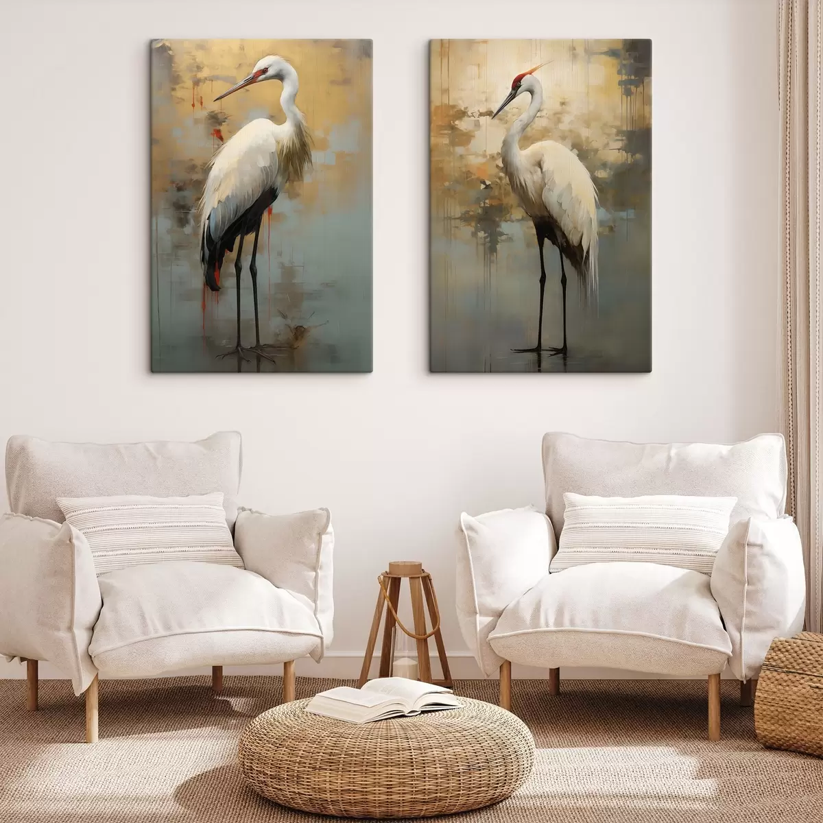 Gemälde Weißer Reiher vor einem Hintergrund aus gedämpften Gelb-, Braun- und Blautönen, der an eine neblige, abstrakte Landschaft erinnert Art. m00530
