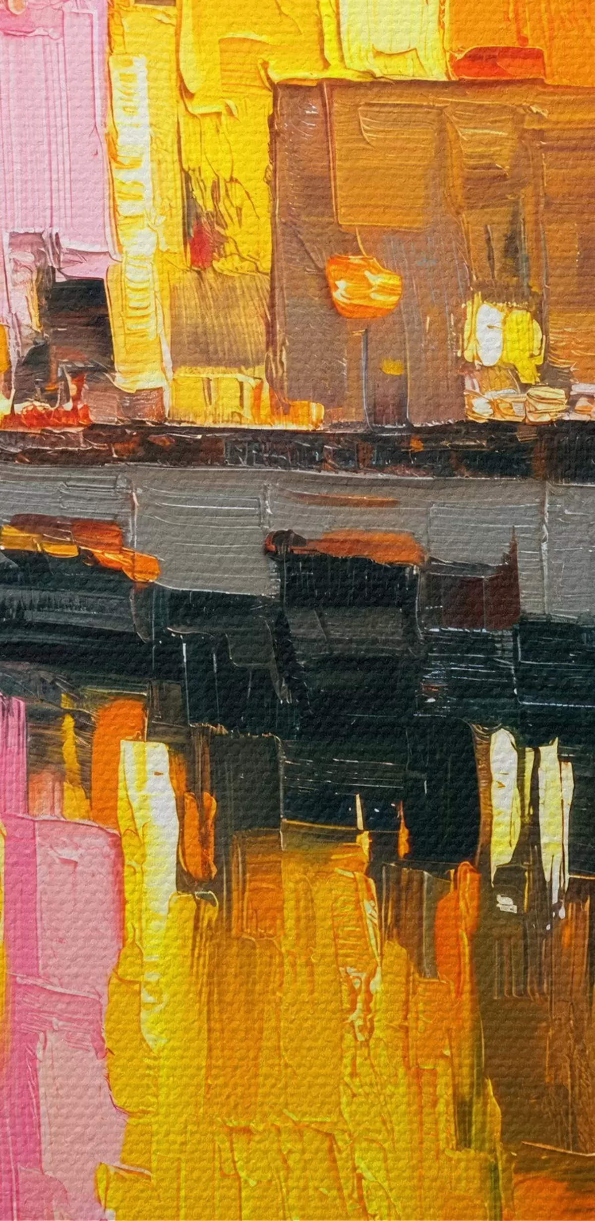Gemälde Dynamik der Stadt: abstrakte Komposition mit Lichtreflexionen auf dem Fluss Art. m00569