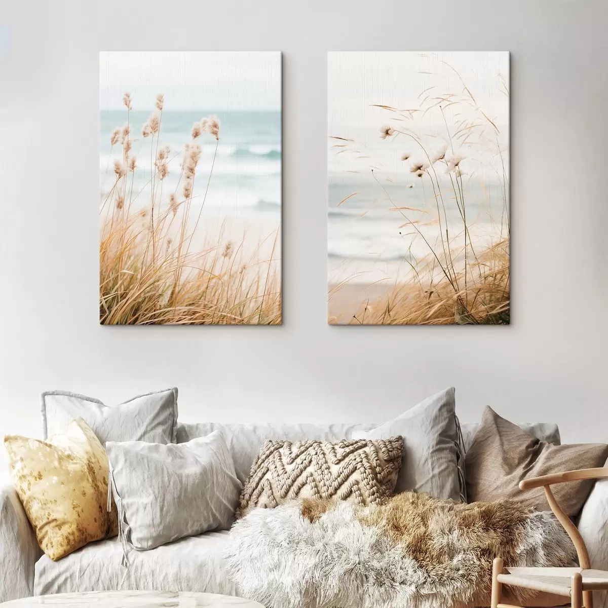 Gemälde Hohes Gras mit flauschigen Samenköpfen, Sandstrand und Meereswellen im Hintergrund, weiche und gedämpfte Farbpalette Art. m00650