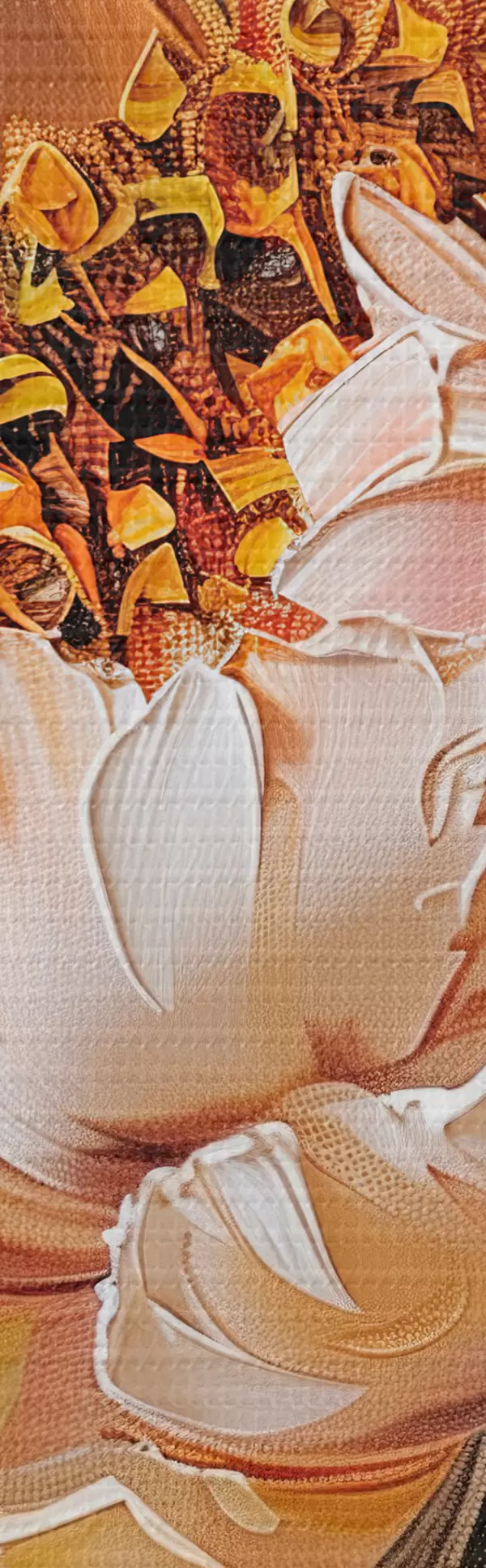 Drei Materialtypen stehen zur Verfügung: Economic Canvas - ein dichtes und haltbares Material für den Digitaldruck, identisch mit Malerleinwand, wasserfeste Oberfläche, realistische Wiedergabe von Details, mittelkörniges Material. Premium Canvas - die Textur ähnelt der einer Malerleinwand (verwobene kleine Fäden). Weiche, detaillierte Wiedergabe des Bildes auf einer matten Oberfläche. Eco-Premium - hochwertiges Gewebe aus 100% Baumwolle. Dank der natürlichen Baumwollfasern ist das Material langlebig und verschleißfest. Hervorragende Farbwiedergabe und Detailtreue.