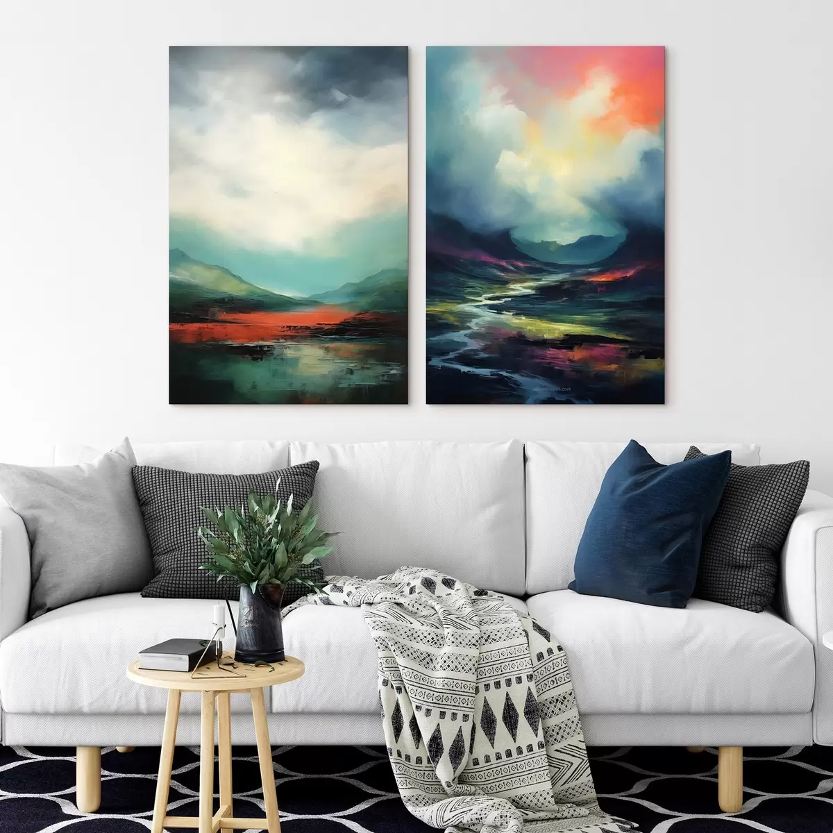 Gemälde Abstrakte Landschaft mit Wolken in Türkis- und Rottönen Art. m00691