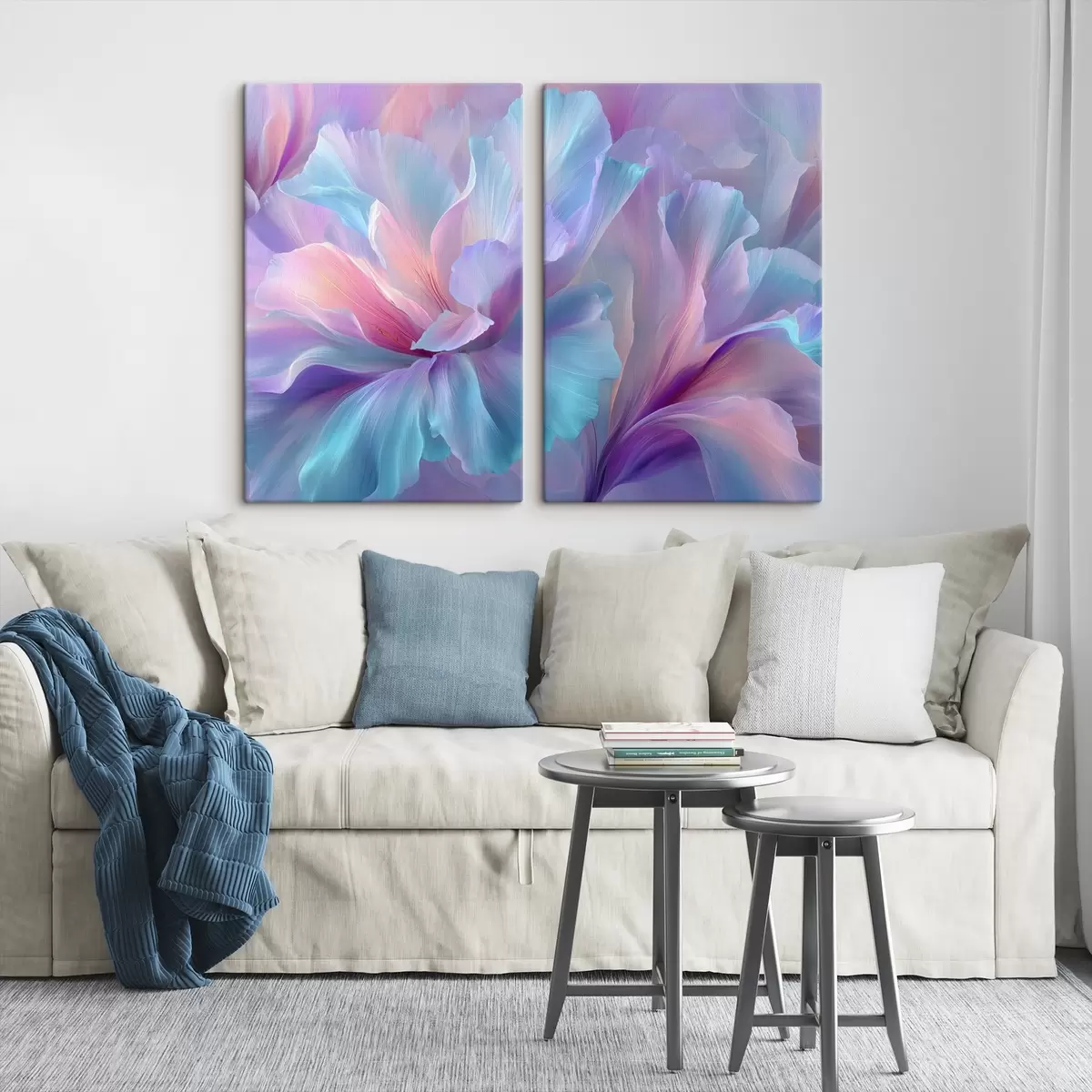 Gemälde eine zarte Fantasieblume mit Blütenblättern in Violett-, Blau- und Rosatönen. Art. m00700
