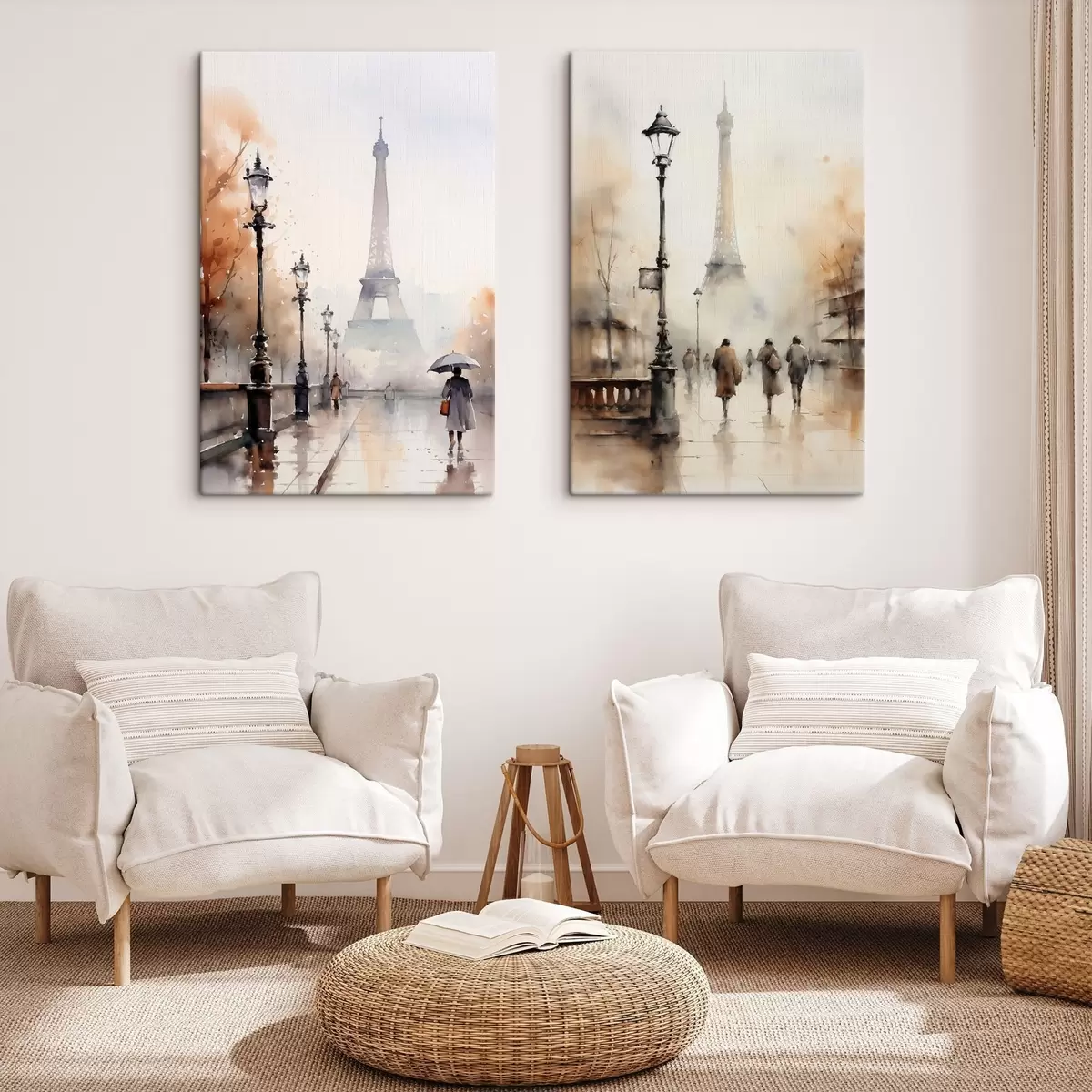 Gemälde Ein regnerischer Herbsttag in Paris mit dem Eiffelturm im Hintergrund und Vintage-Straßenlaternen Art. m00821