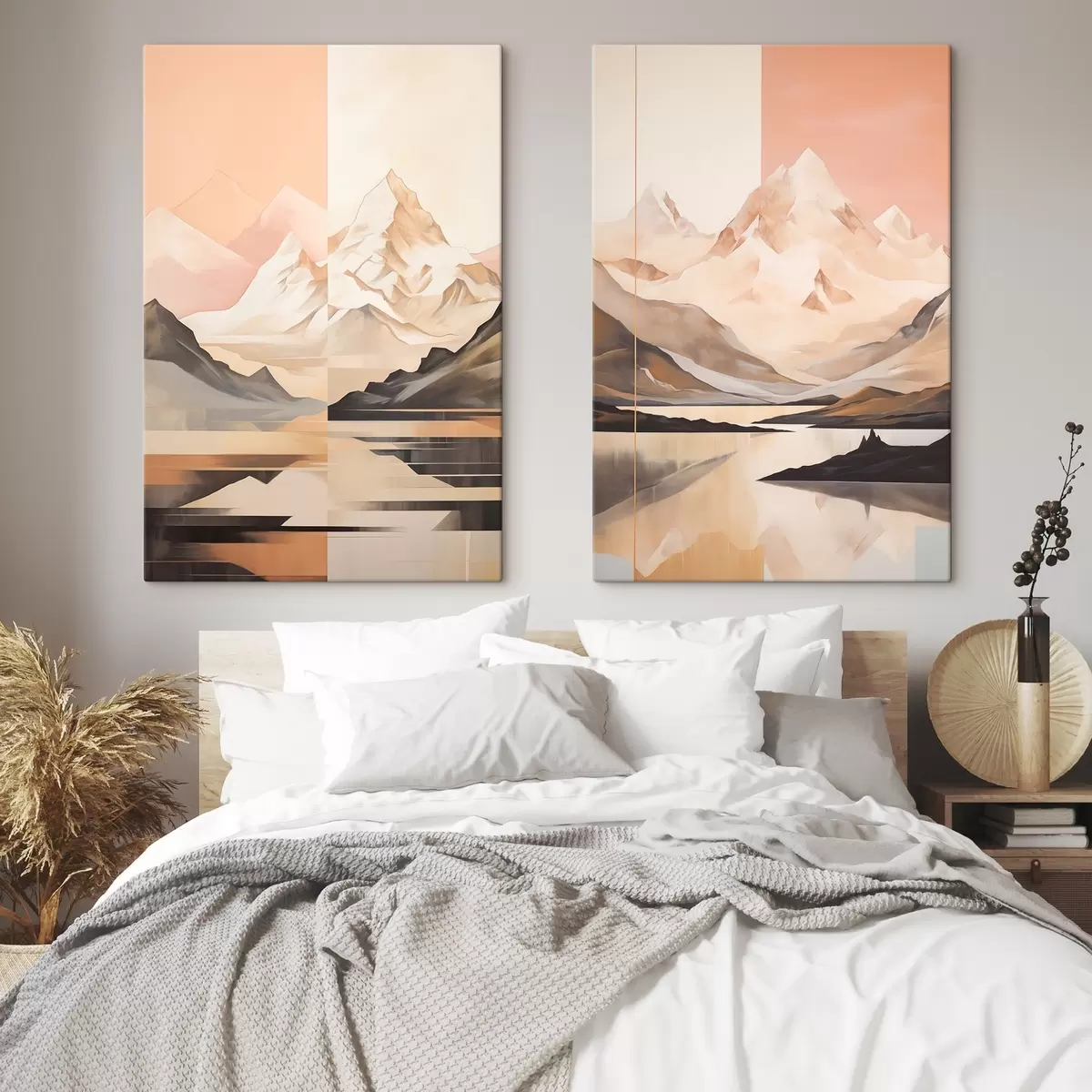 Gemälde Abstrakte Landschaft mit Bergen und einem See, Pastellfarben, minimalistischer Stil Art. m00830