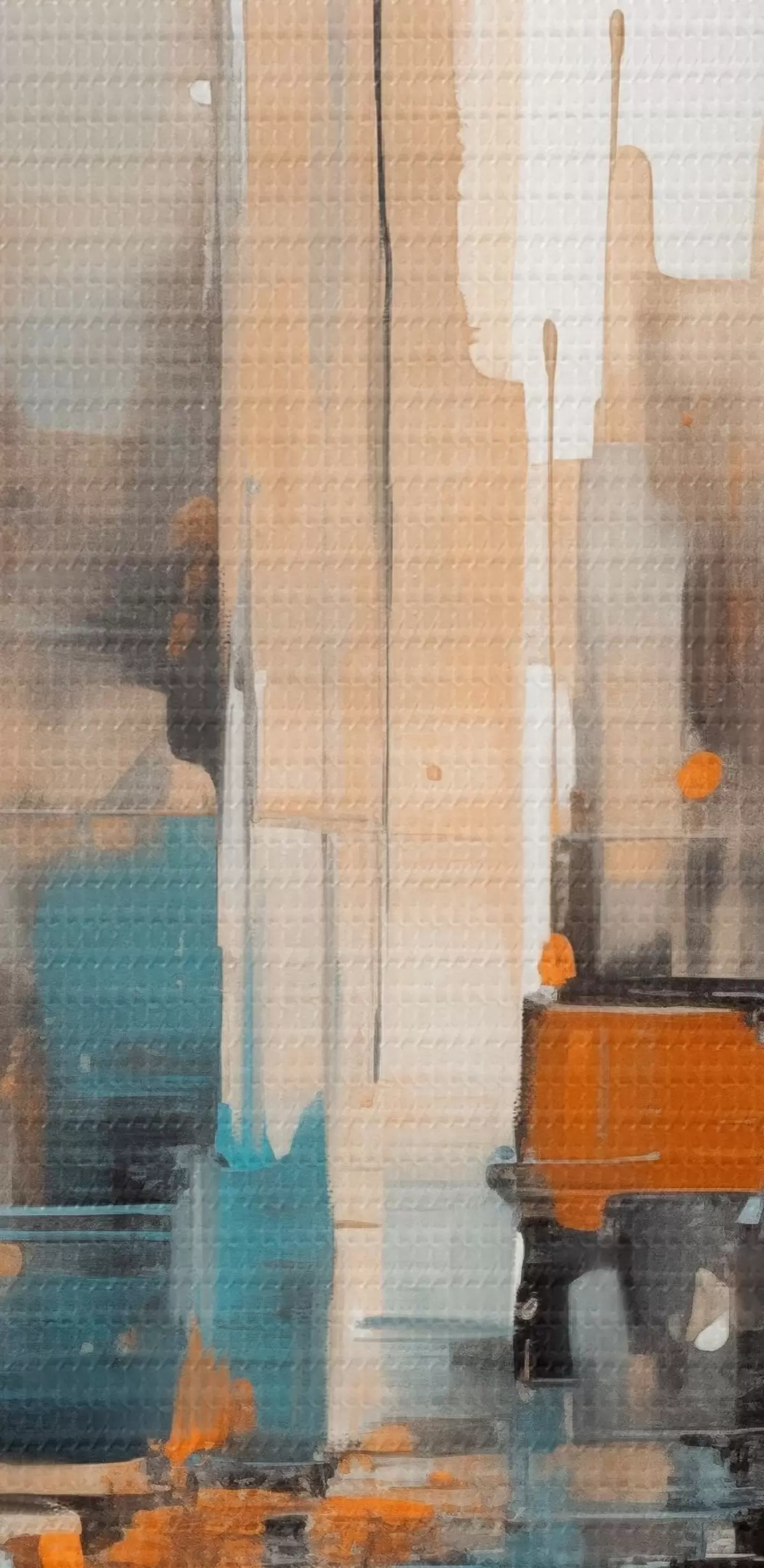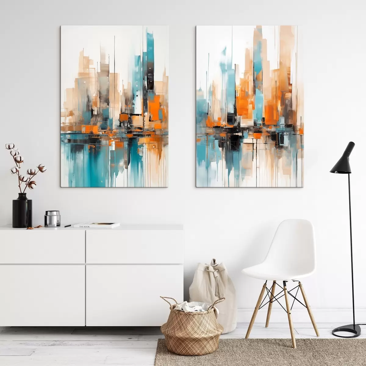 Gemälde Abstrakte Stadtlandschaft mit vertikalen Pinselstrichen in Orange-, Blau- und Weißtönen, Malstil Art. m00876