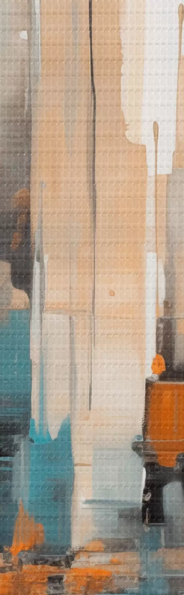 Fototapete Abstrakte Stadtlandschaft mit vertikalen Pinselstrichen in Orange-, Blau- und Weißtönen, Malstil m00876