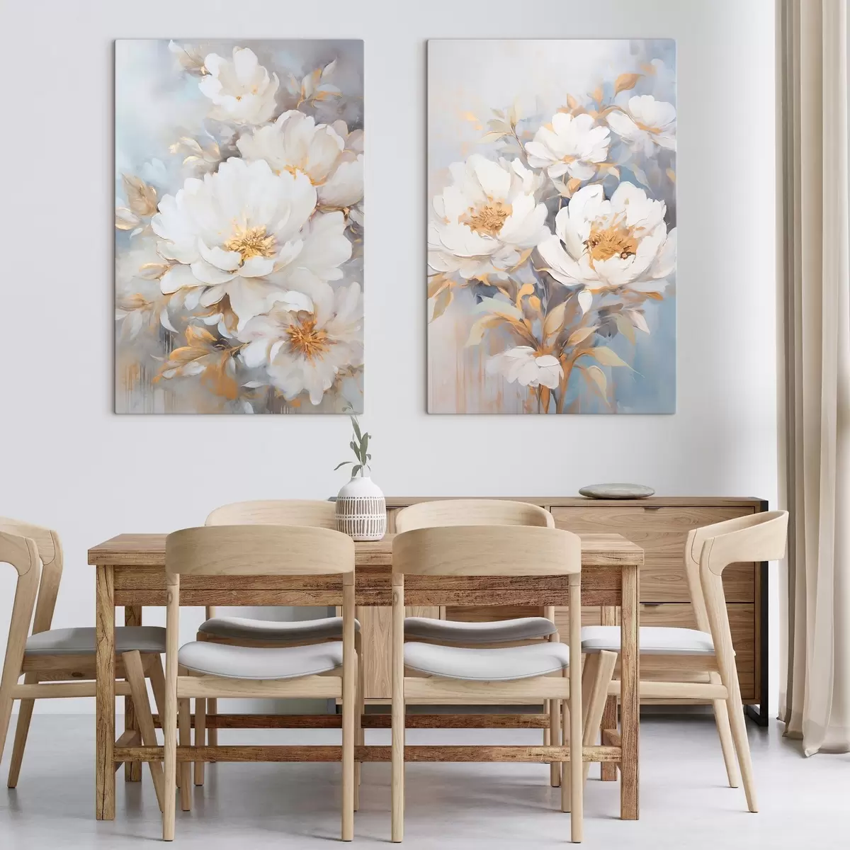 Gemälde Weiße Pfingstrosen mit gelben Blütenkernen und Blättern, sanfte Pinselstriche, hellblauer Hintergrund, Blumenarrangement Art. m00878