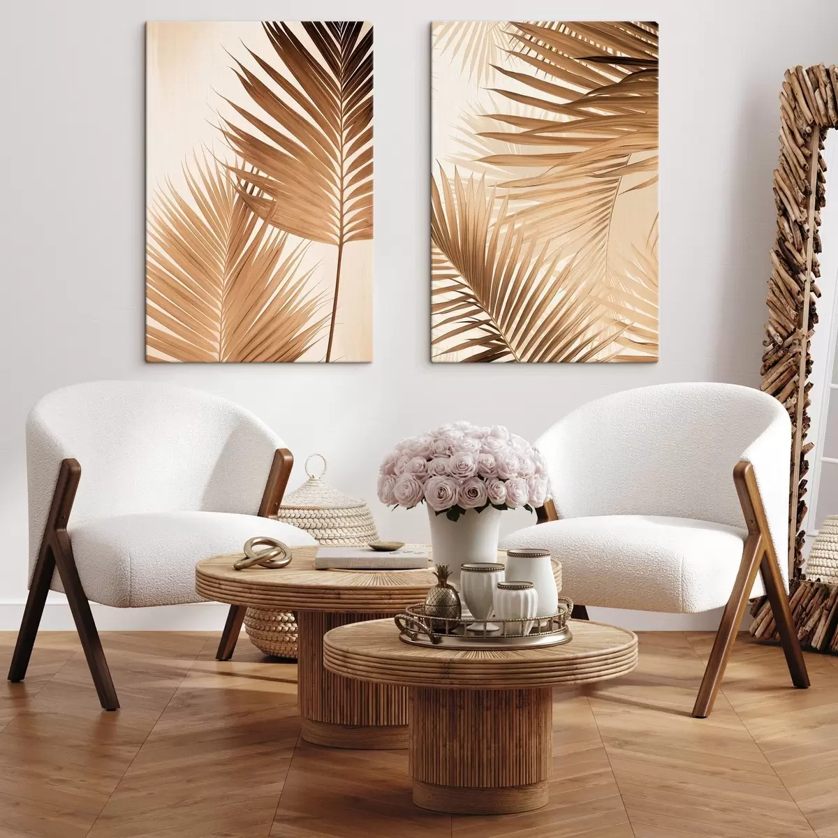 Gemälde Palmenblätter in Brauntönen, neutraler Hintergrund, minimalistischer Stil, natürliche Beleuchtung, tropisches Flair Art. m00880
