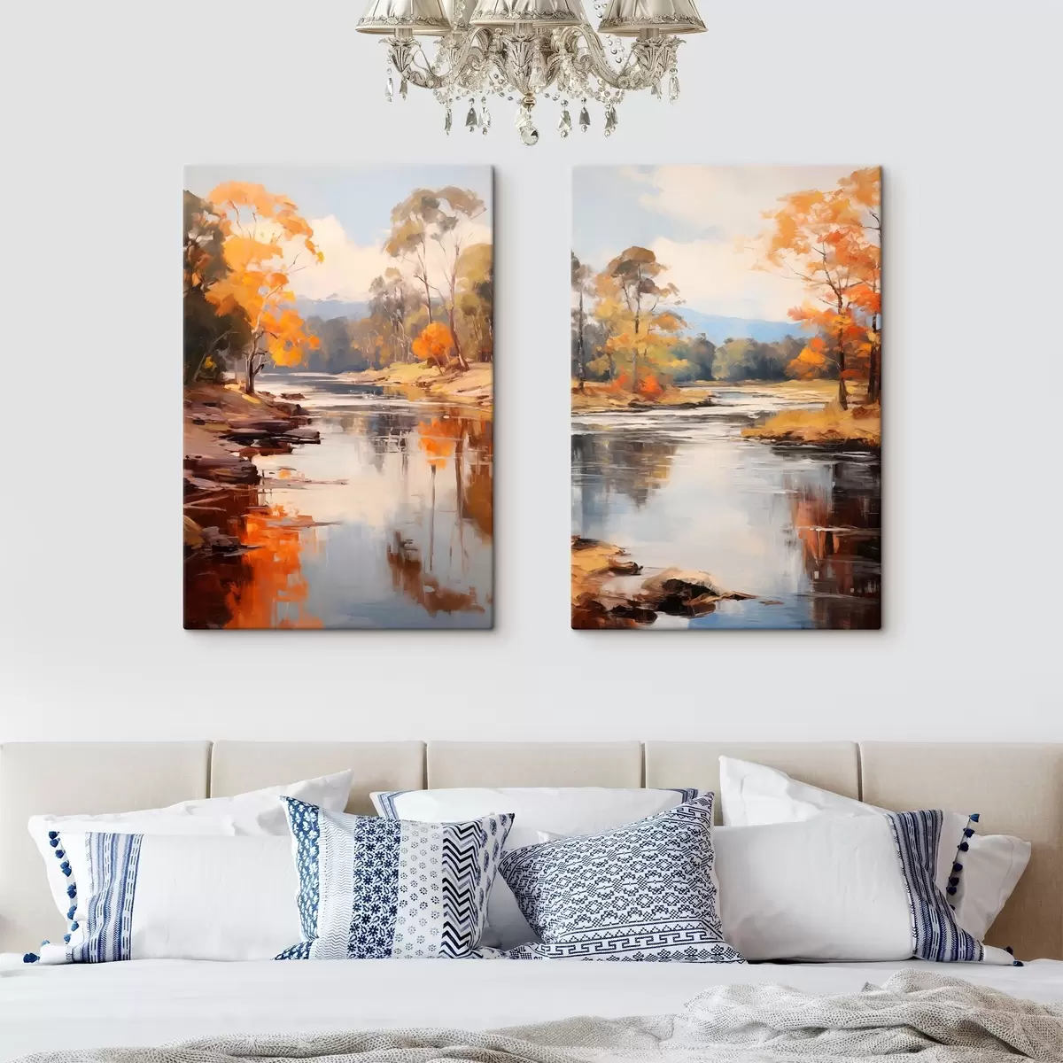 Gemälde Herbstlandschaft, Fluss mit Bäumen am Ufer, Wald im Hintergrund, Spiegelungen auf dem Wasser Art. m00883