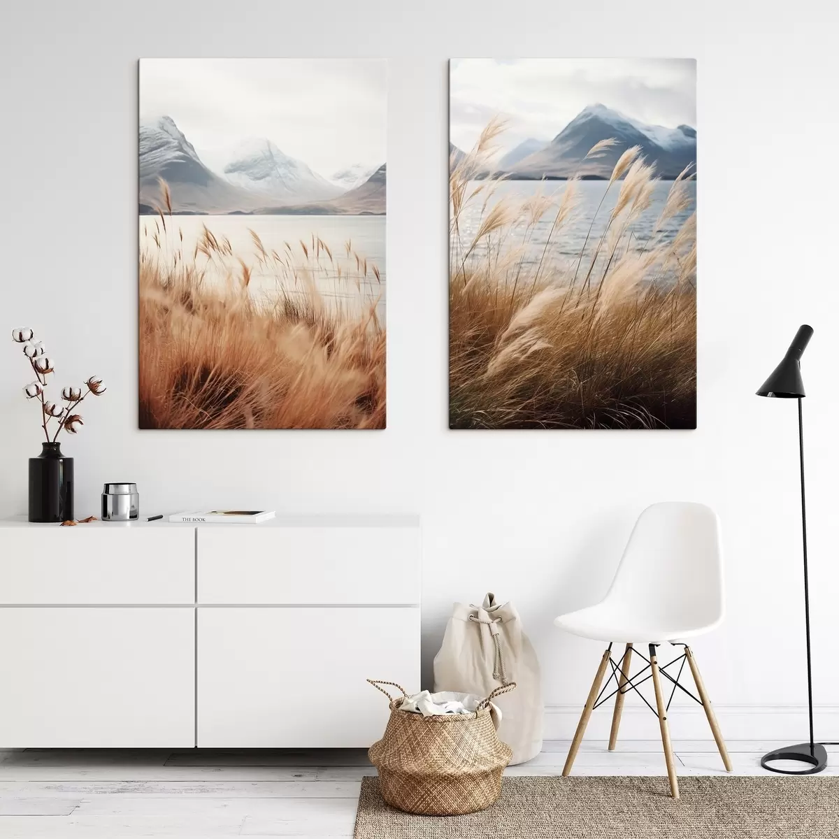 Gemälde Pampasgras mit einem See und Bergen im Hintergrund, sanfte Beleuchtung, gedämpfte Farben, naturalistischer Stil Art. m00884