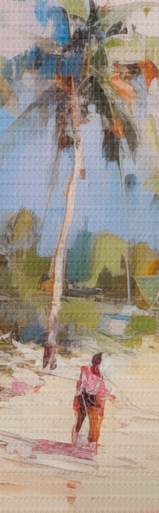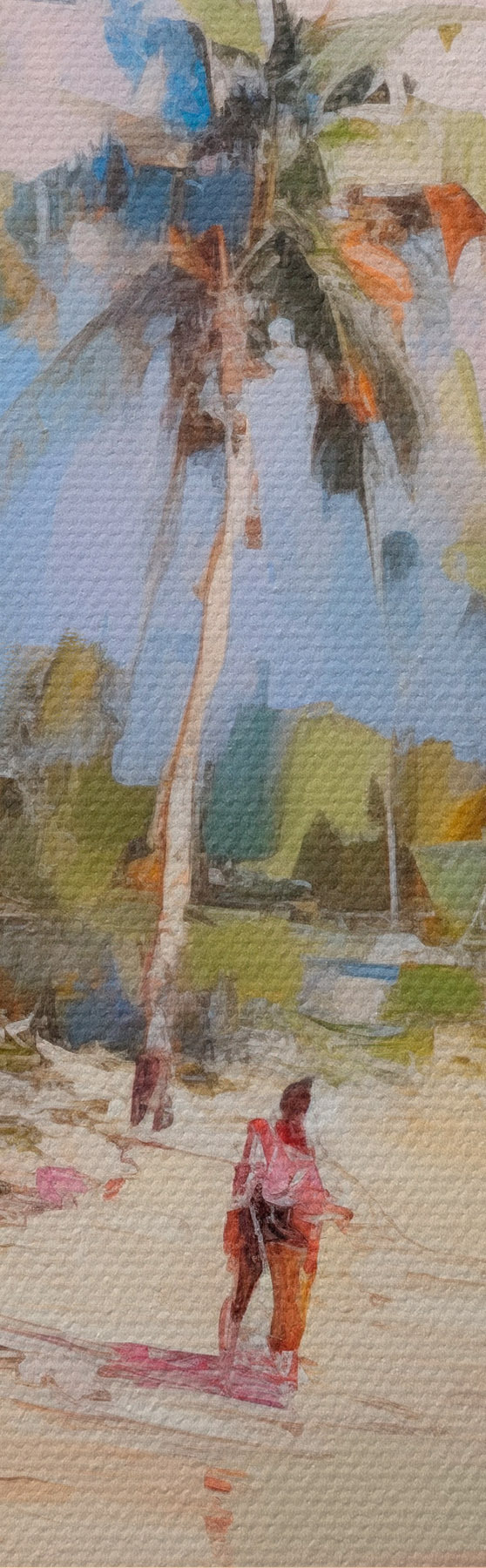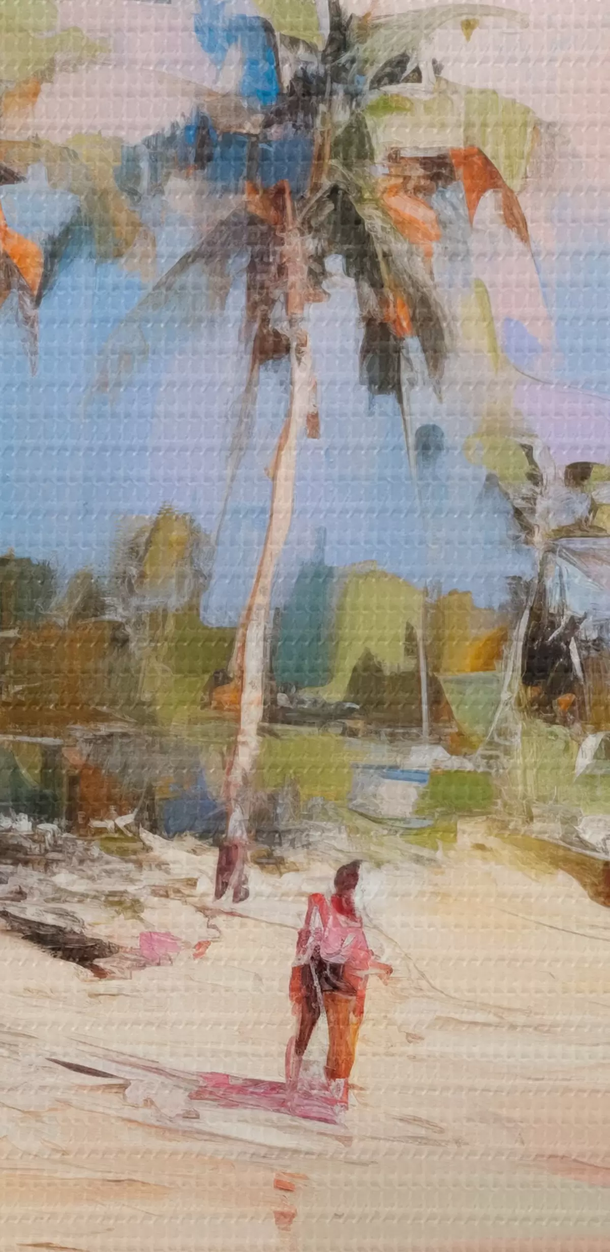 Gemälde Abstrakte Landschaft, ein Strand mit Palmen, strahlender Sonnenschein mit blauem Himmel und einigen Wolken Art. m00885