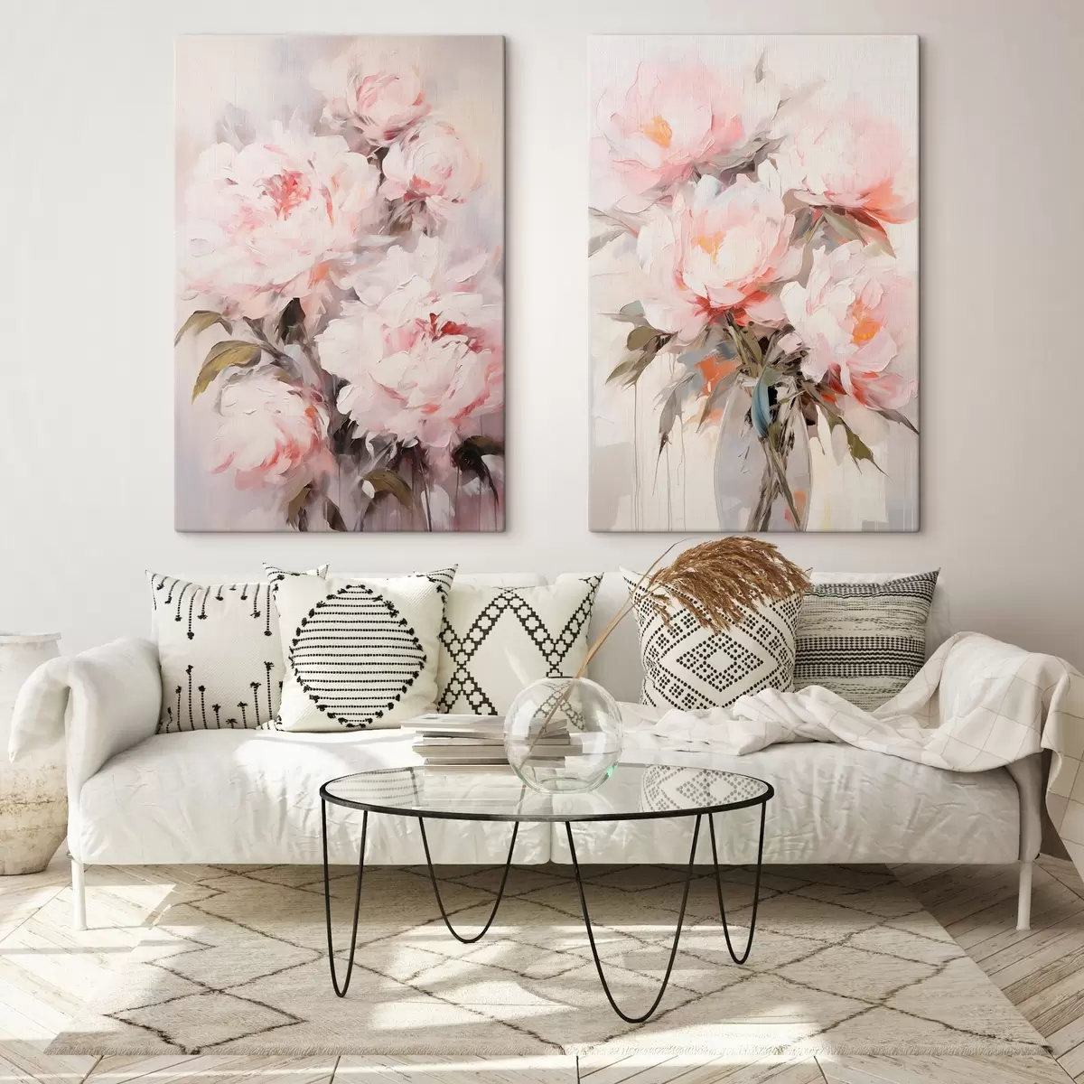 Gemälde Ein Strauß hellrosa Pfingstrosen mit grünen Blättern, sanfte Pinselstriche, Pastellfarben, auf hellem Hintergrund Art. m00890