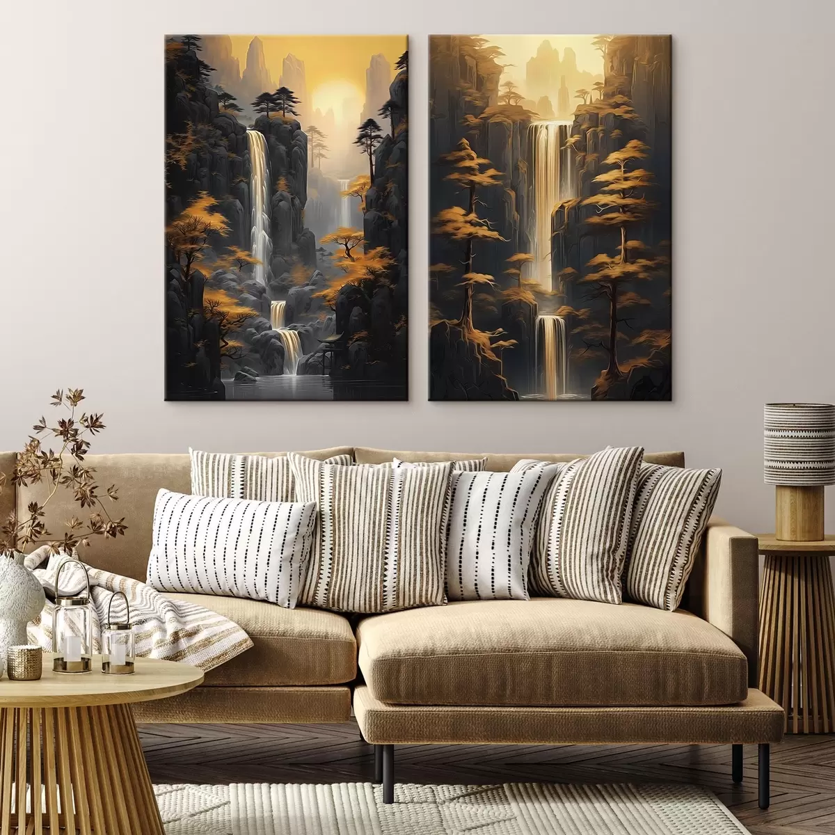 Gemälde Landschaft mit Wasserfall und Bergen in goldenem Licht Art. m00928