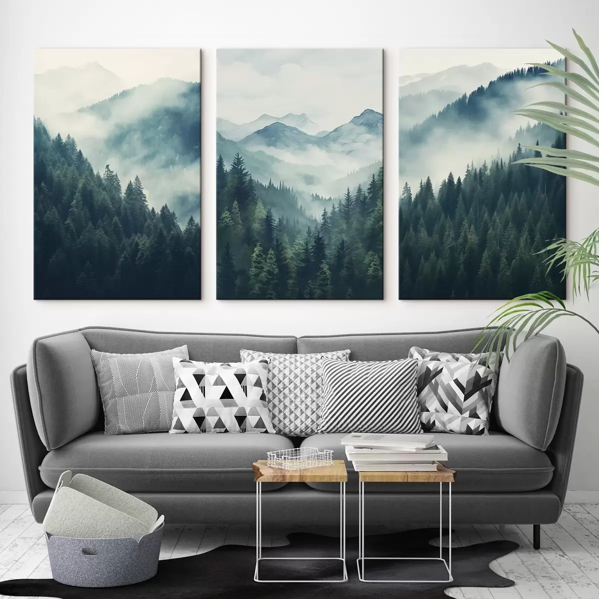 Gemälde Nebelverhangene Kiefernberge in sanften Grün- und Blautönen Art. m00964