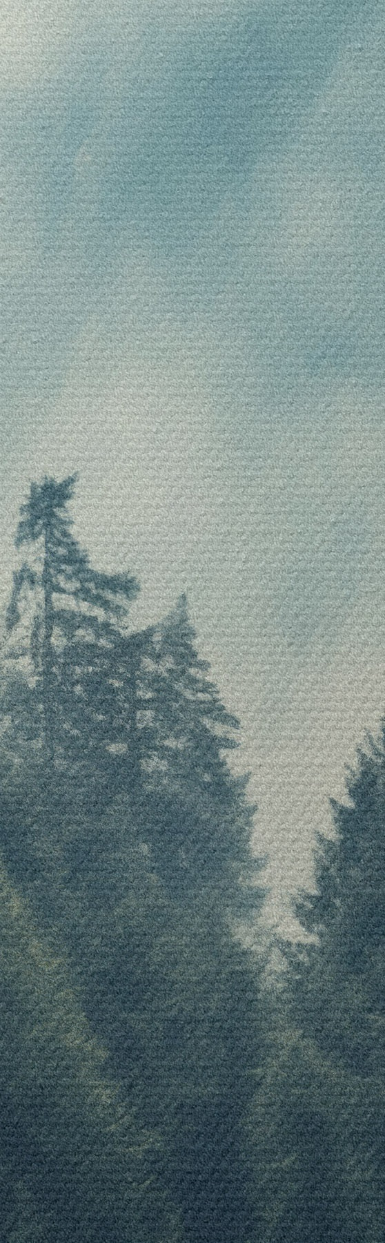 Fototapete Nebelverhangene Kiefernberge in sanften Grün- und Blautönen m00964