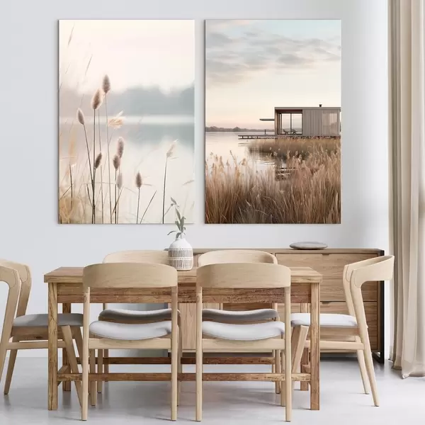 Gemälde Weiche Schilfpflanzen an einem ruhigen See und eine moderne Hütte am Ufer Art. m00970