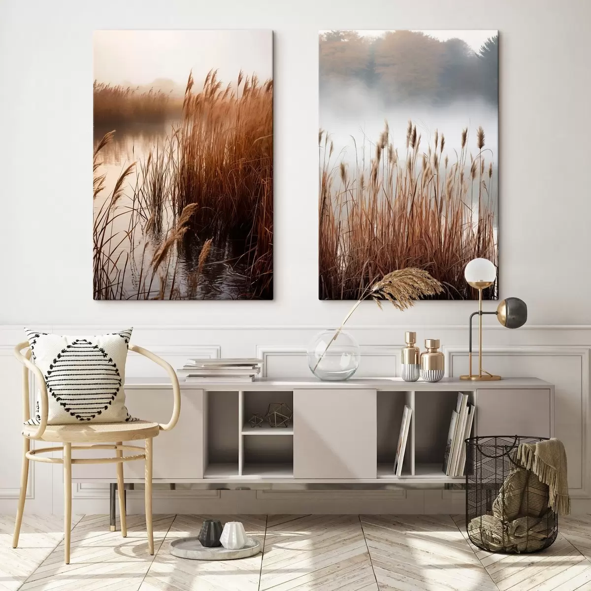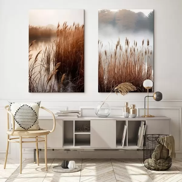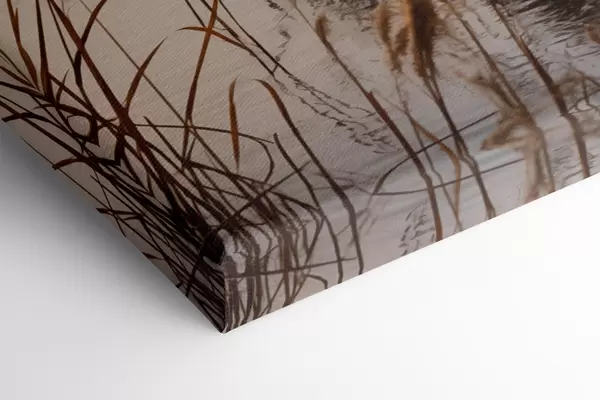 Gemälde Hohe Schilfpflanzen wachsen in einem Gewässer, das Wasser spiegelt die Schilfpflanzen wider, nebliger Hintergrund, sanftes Licht, Naturszene Art. m01008