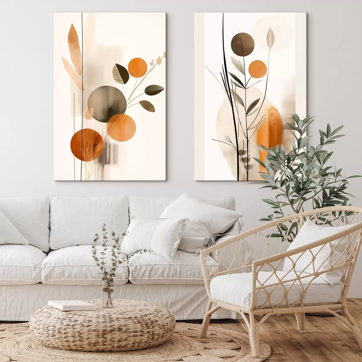 Gemälde Abstrakte Malerei-Imitation mit orangefarbenen und grauen Kreisen, Blättern und Zweigen, moderner Stil, Aquarelleffekt Art. m01009
