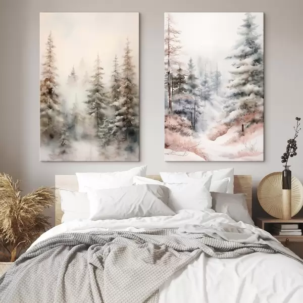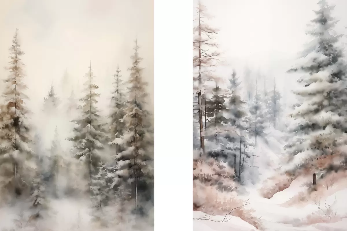 Gemälde Hohe, schneebedeckte Kiefern stehen in einem nebligen Wald, eine sanfte, gedämpfte Winterszene. Art. m01011
