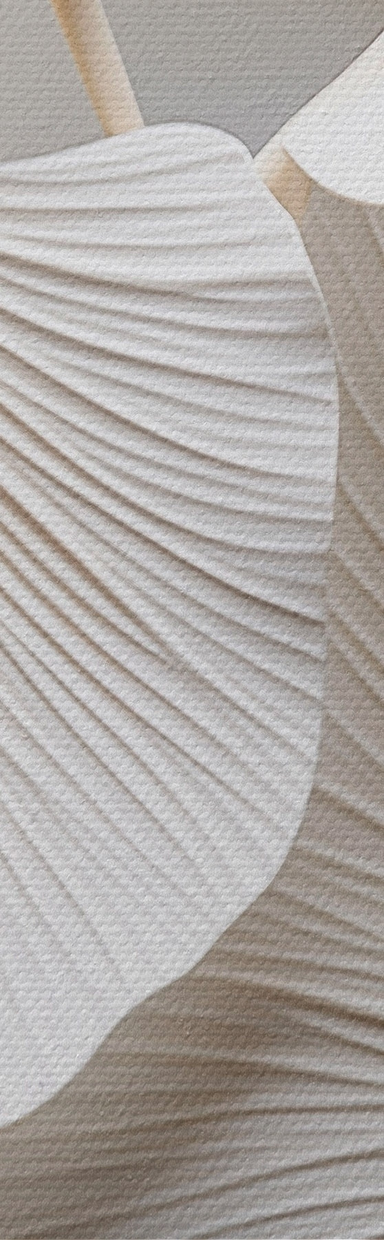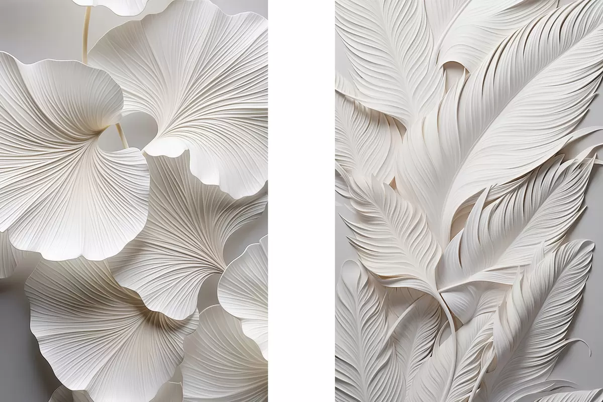 Fototapete Weiße Ginkgoblätter und lange Blätter mit filigranen Details, die einen strukturierten und vielschichtigen Effekt erzeugen, minimalistische Kunst m01013