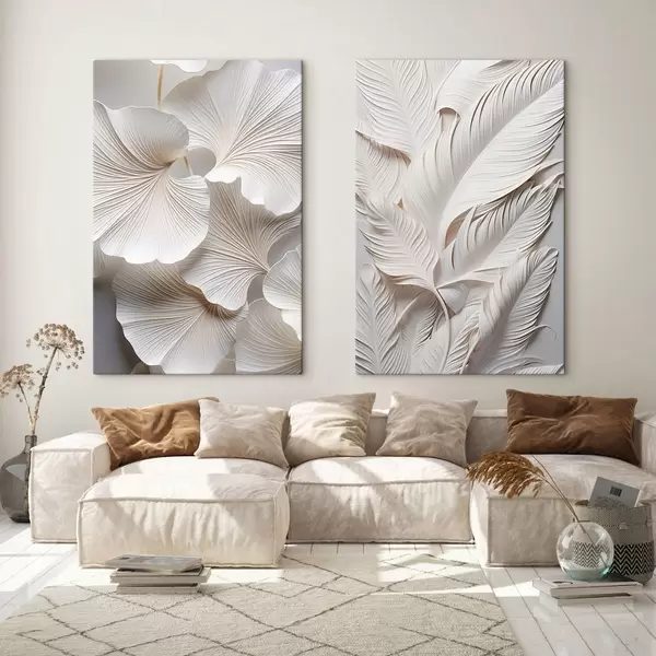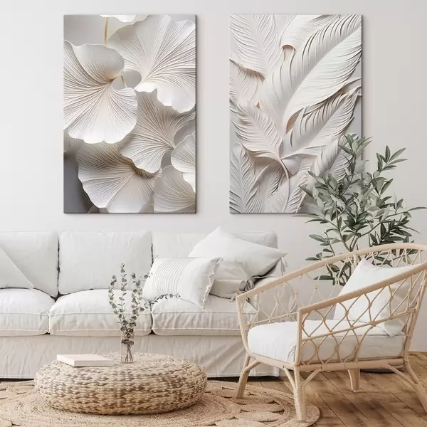 Gemälde Weiße Ginkgoblätter und lange Blätter mit filigranen Details, die einen strukturierten und vielschichtigen Effekt erzeugen, minimalistische Kunst Art. m01013