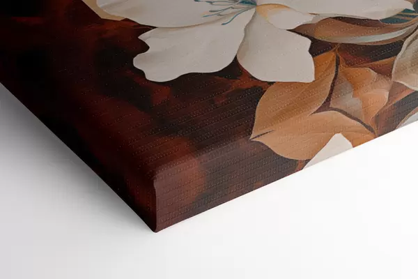 Gemälde Abstrakte weiße Blumen und Blätter vor einem Hintergrund aus Braun und Blau mit abstrakten Formen, in minimalistischem Stil Art. m01015