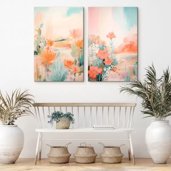 Gemälde Blumenmotive in Pastelltönen vor dem Hintergrund eines leicht nebligen Tals Art. m01085