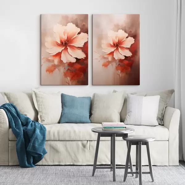 Gemälde Blumenkomposition: weiße und cremefarbene Blütenblätter, korallenrote Akzente und ein sanfter, nebliger Hintergrund Art. m01088