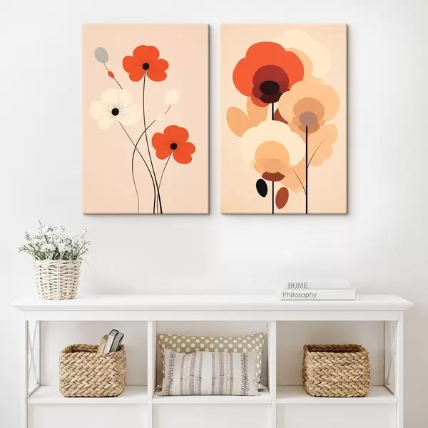 Gemälde Minimalistisches Blumendiptychon in warmen Beige-Korallentönen mit grafischen Linien Art. m01090