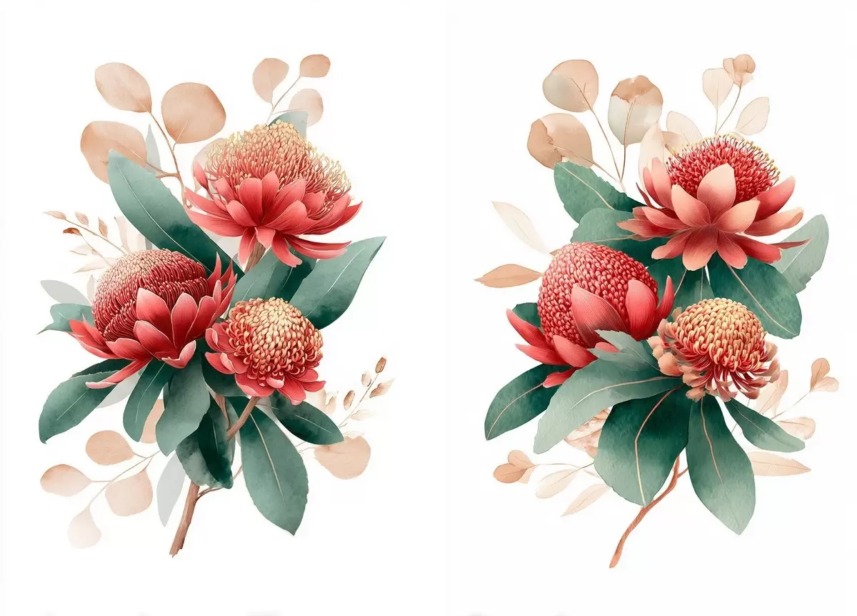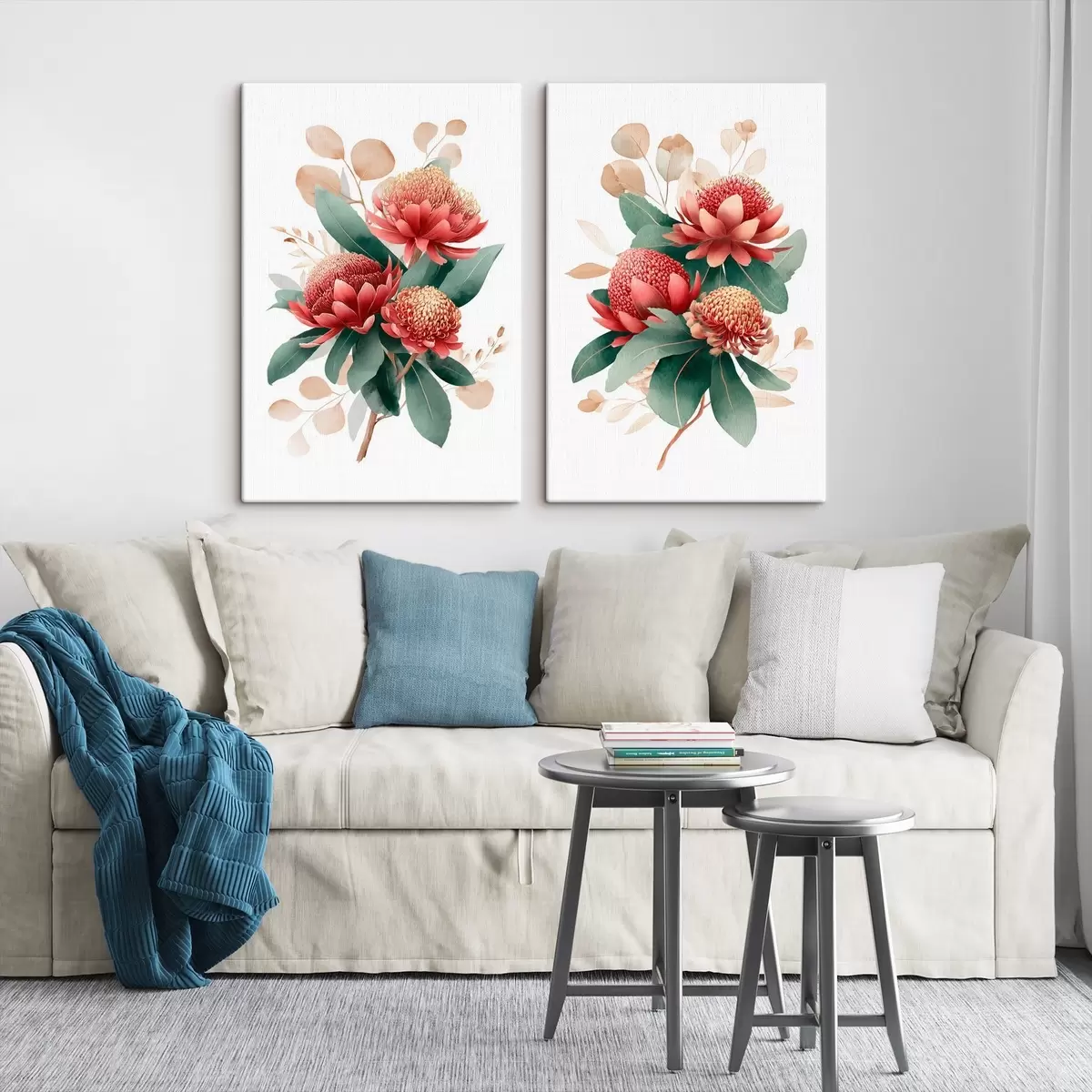 Gemälde Blumenarrangement mit Proteas in Korallenrot auf weißem Hintergrund Art. m01096