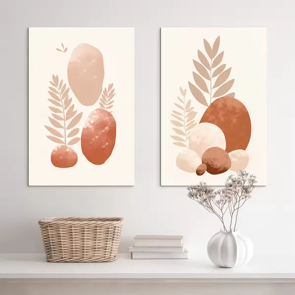 Gemälde Abstrakte Formen, strukturierte Steine und Blätter in gedeckten Pfirsich- und Terrakottatönen, minimalistisch, cremefarbener Hintergrund Art. m01114