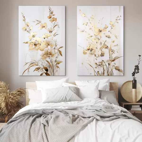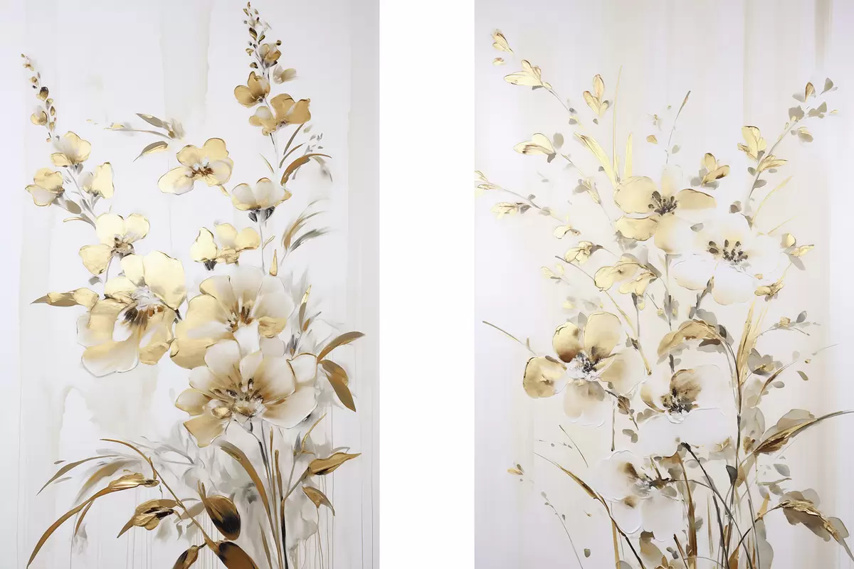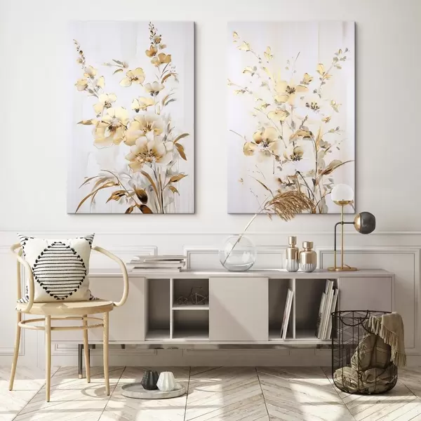 Gemälde Strukturierte gelbe Blüten und Blätter vor weißem Hintergrund, mit zarten Pinselstrichen Art. m01116