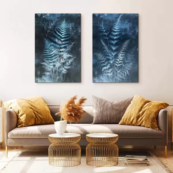Gemälde Blaue Farne und Pflanzen vor einem dunklen, strukturierten Hintergrund, mit Fokus auf den komplexen Details, Röntgeneffekt Art. m01121